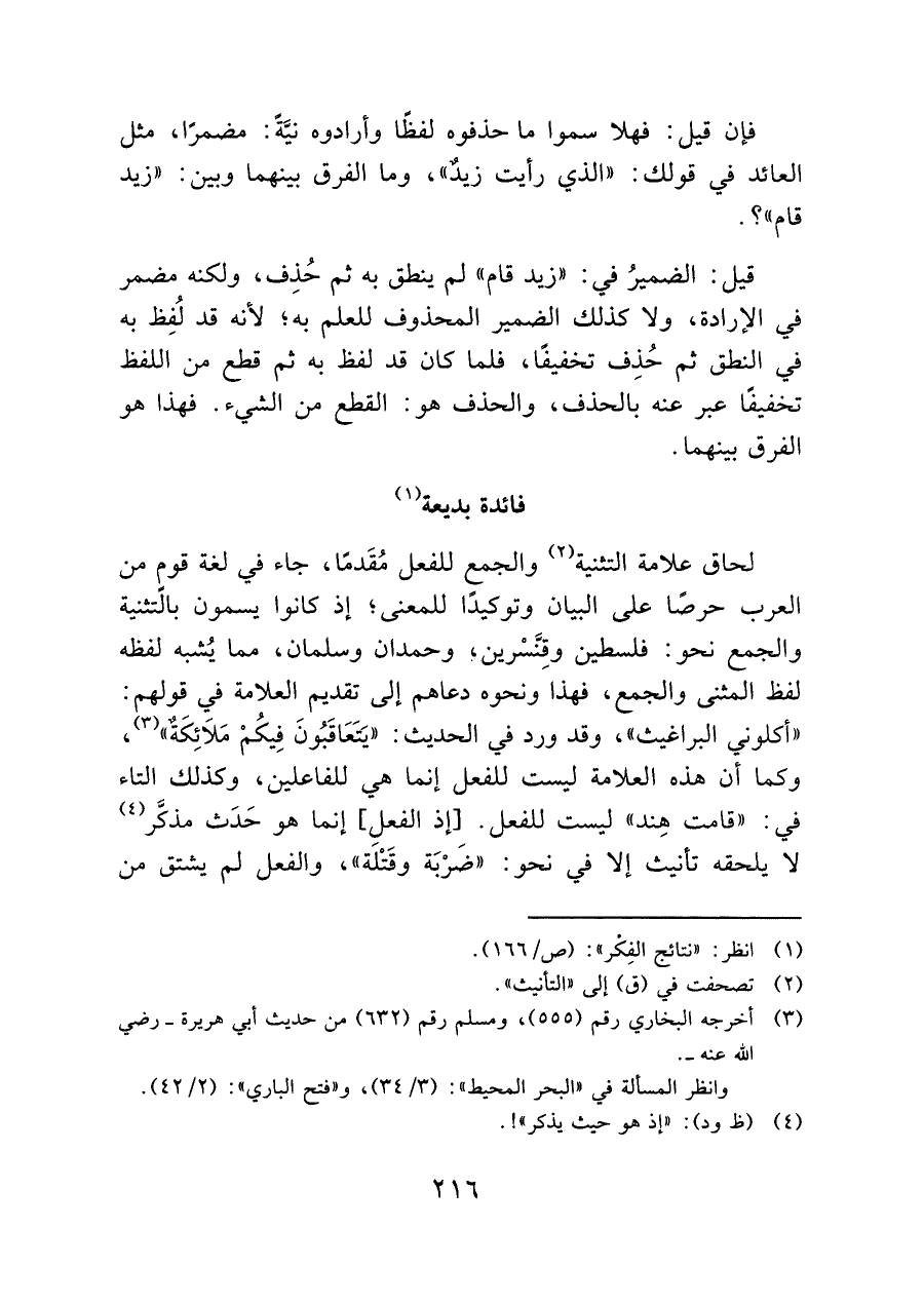 لحاق علامة التثنية (¬٢) والجمع للفعل مُقَدمًا، جاء في لغة قومٍ من العرب حرصًا على البيان وتوكيدًا للمعنى؛ إذ كانوا يسمون بالتثنية والجمع نحو: فلسطين وقِنَّسْرين، وحمدان وسلمان، مما يُشبه لفظه لفظ المثنى والجمع، فهذا ونحوه دعاهم إلى تقديم العلامة في قولهم: "أكلونى البراغيث"، وقد ورد فى الحديث: "يَتَعَاقَبُونَ فِيكُمْ مَلائِكَةٌ" (¬٣)، وكما أن هذه العلامة ليست للفعل إنما هي للفاعلين، وكذلك التاء في: "قامت هِند" ليست للفعل. [إذ الفعل] إنما هو حَدَث مذكَّر (¬٤) لا يلحقه تأنيث إلا في نحو: "ضرْبَة وقَتْلَة"، والفعل لم يشتق من