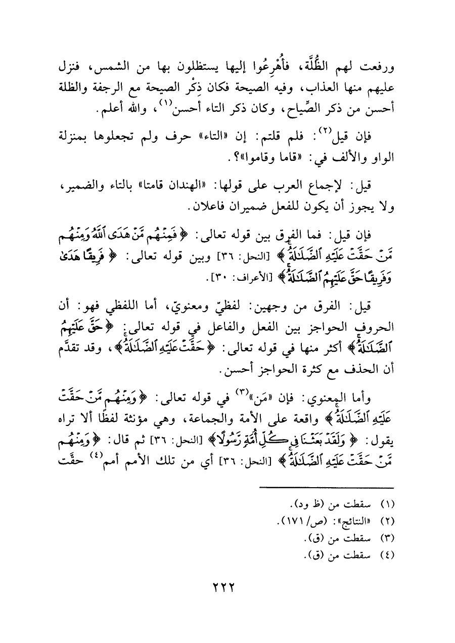 وأما المعنوي: فإِن "مَن" (¬٣) في قوله تعالى: {وَمِنْهُمْ مَنْ حَقَّتْ عَلَيْهِ الضَّلَالَةُ} واقعة على الأمة والجماعة، وهي مؤنثة لفظًا ألا تراه يقول: {وَلَقَدْ بَعَثْنَا فِي كُلِّ أُمَّةٍ رَسُولًا} [النحل: ٣٦] ثم قال: {وَمِنْهُمْ مَنْ حَقَّتْ عَلَيْهِ الضَّلَالَةُ} [النحل: ٣٦] أي من تلك الأمم أمم (¬٤) حقَّت