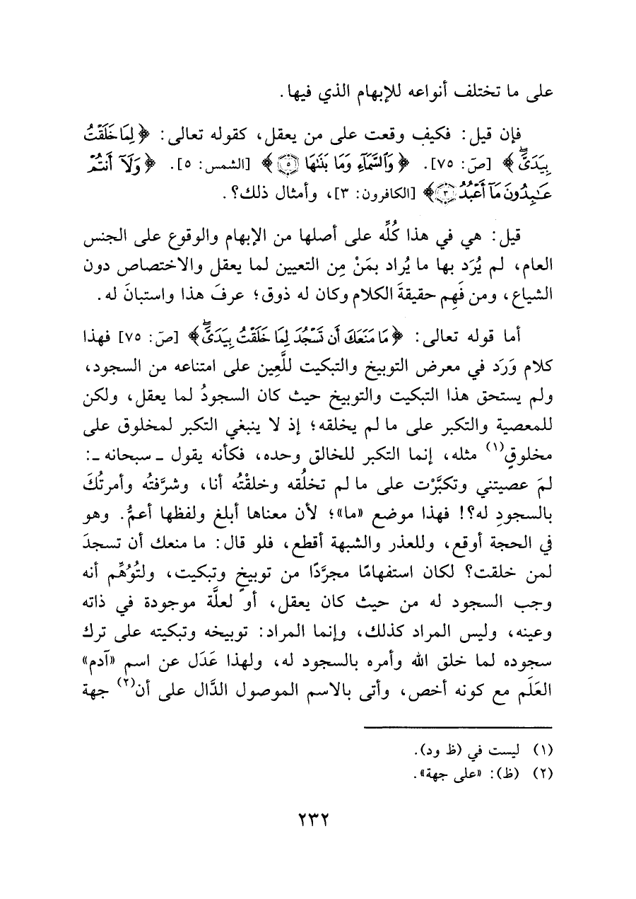أما قوله تعالى: {مَا مَنَعَكَ أَنْ تَسْجُدَ لِمَا خَلَقْتُ بِيَدَيَّ} [ص: ٧٥] فهذا كلام وَرَد في معرض التوبيخ والتبكيت للَّعِين على امتناعه من السجود، ولم يستحق هذا التبكيت والتوبيخ حيث كان السجودُ لما يعقل، ولكن للمعصية والتكبر على ما لم يخلقه؛ إذ لا ينبغي التكبر لمخلوق على مخلوقٍ (¬١) مثله، إنما التكبر للخالق وحده، فكأنه يقول -سبحانه-: لمَ عصيتني وتكبَّرْت على ما لم تخلُقه وخلفَتُه أنا، وشرَّفتُه وأمرتُكَ بالسجودِ له؟! فهذا موضع "ما"؛ لأن معناها أبلغ ولفظها أعمُّ. وهو في الحجة أوقع، وللعذر والشبهة أقطع، فلو قال: ما منعك أن تسجدَ لمن خلقت؟ لكان استفهامًا مجوَّدًا من توبيخ وتبكيت، ولتُوُهِّم أنه وجب السجود له من حيث كان يعقل، أو لعلَّة موجودة في ذاته وعينه، وليس المراد كذلك، وإنما المراد: توبيخه وتبكيته على ترك سجوده لما خلق الله وأمره بالسجود له، ولهذا عَدَل عن اسم "آدم" العَلَم مع كونه أخص، وأتى بالاسم الموصول الدَّال على أن (¬٢) جهة