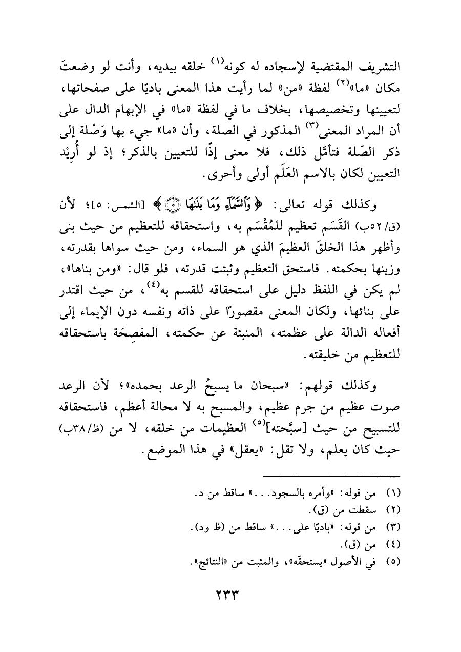 وكذلك قوله تعالى: {وَالسَّمَاءِ وَمَا بَنَاهَا (٥)} [الشمس: ٥]؛ لأن (ق/٥٢ ب) القَسَم تعظيم للمُقْسَم يه، واستحقاقه للتعظيم من حيث بنى وأظهر هذا الخلقَ العظيمَ الذي هو السماء، ومن حيث سواها بقدرته، وزينها بحكمته. فاستحق التعظيم وثبتت قدرته، فلو قال: "ومن بناها"، لم يكن في اللفظ دليل على استحقاقه للقسم به (¬٤)، من حيث اقتدر على بنائها، ولكان المعنى مقصورًا على ذاته ونفسه دون الإيحاء إلى أفعاله الدالة على عظمته، المنبئة عن حكمته، المفصِحَة باستحقاقه للتعظيم من خليقته.