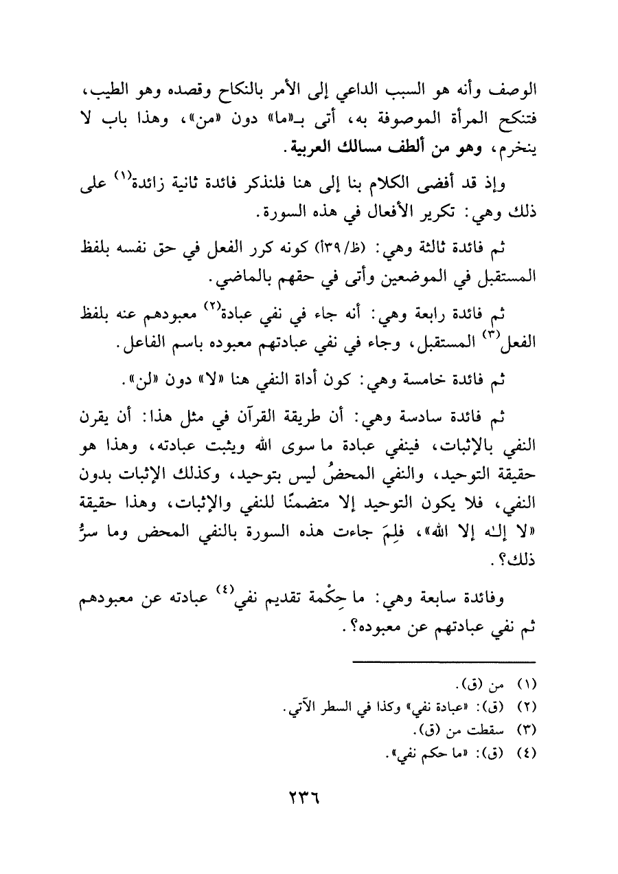 ثم فائدة سادسة وهي: أن طريقة القرآن في مثل هذا: أن يقرن النفي بالإثبات، فينفي عبادة ما سوى الله ويثبت عبادته، وهذا هو حقيقة التوحيد، والنفي المحض ليس بتوحيد، وكذلك الإثبات بدون النفي، فلا يكون التوحيد إلا متضمنًا للخفي والإثبات، وهذا حقيقة "لا إله إلا الله"، فلِمَ جاءت هذه السورة بالنفي المحض وما سرُّ ذلك؟ ..