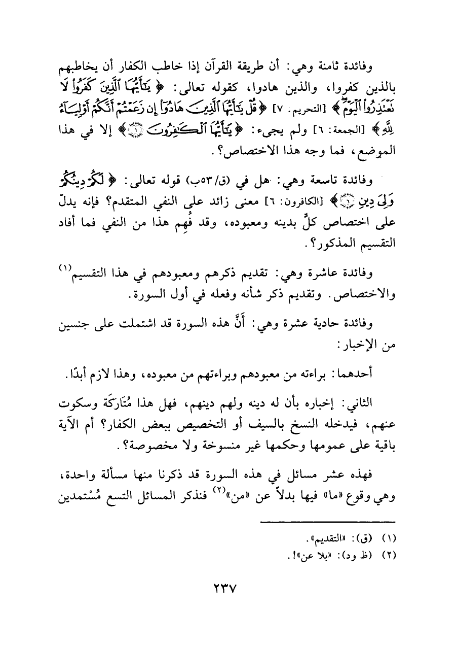 وفائدة تاسعة وهي: هل في (ق/٥٣ ب) قوله تعالى: {لَكُمْ دِينُكُمْ وَلِيَ دِينِ (٦)} [الكافرون: ٦] معنى زائد على النفي المتقدم؟ فإنه يدلّ على اختصاص كلٍّ بدينه ومعبوده، وقد فُهِم هذا من النفي فما أفاد التقسيم المذكور؟.