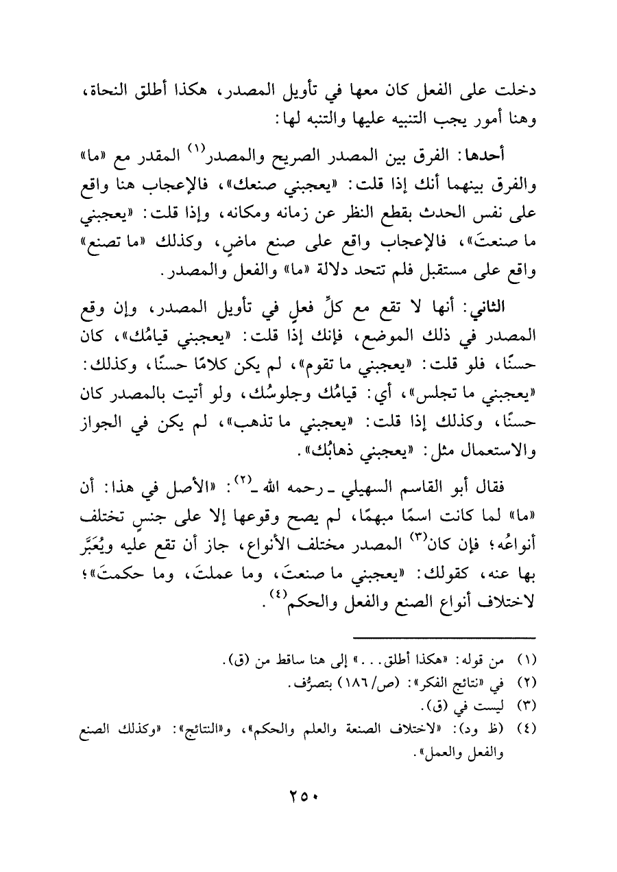 فقال أبو القاسم السهيلي -رحمه الله (¬٢) -: "الأصل في هذا: أن "ما" لما كانت اسمًا مبهمًا، لم يصح وقوعها إلا على جنسٍ تختلف أنواعُه؛ فإن كان (¬٣) المصدر مختلف الأنواع، جار أن تقع عليه ويُعَبَّر بها عنه، كقولك: "يعجبني ما صنعتَ، وما عملتَ، وما حكمتَ"؛ لاختلاف أنواع الصنع والفعل والحكم (¬٤).