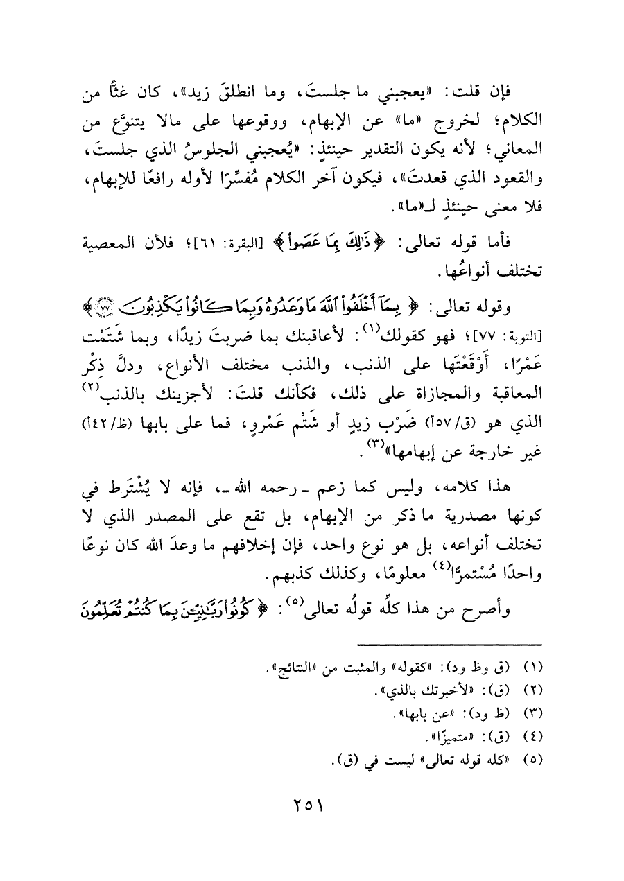 وقوله تعالى: {بِمَا أَخْلَفُوا اللَّهَ مَا وَعَدُوهُ وَبِمَا كَانُوا يَكْذِبُونَ (٧٧)} [التوبة: ٧٧]؛ فهو كقولك (¬١): لأعاقبنك بما ضربتَ زيدًا، وبما شَتَمْت عَمْرًا، أَوْقَعْتَها على الذنب، والذنب مختلف الأنواع، ودلَّ ذِكْر المعاقبة والمجازاة على ذلك، فكأنك قلتَ: لأجزينك بالذنب (¬٢) الذي هو (ق/ ٥٧ أ)، ضَرْب زيدٍ أو شَتْم عَمْروٍ، فما على بابها (ظ/٤٢ أ) غير خارجة عن إبهامها" (¬٣).