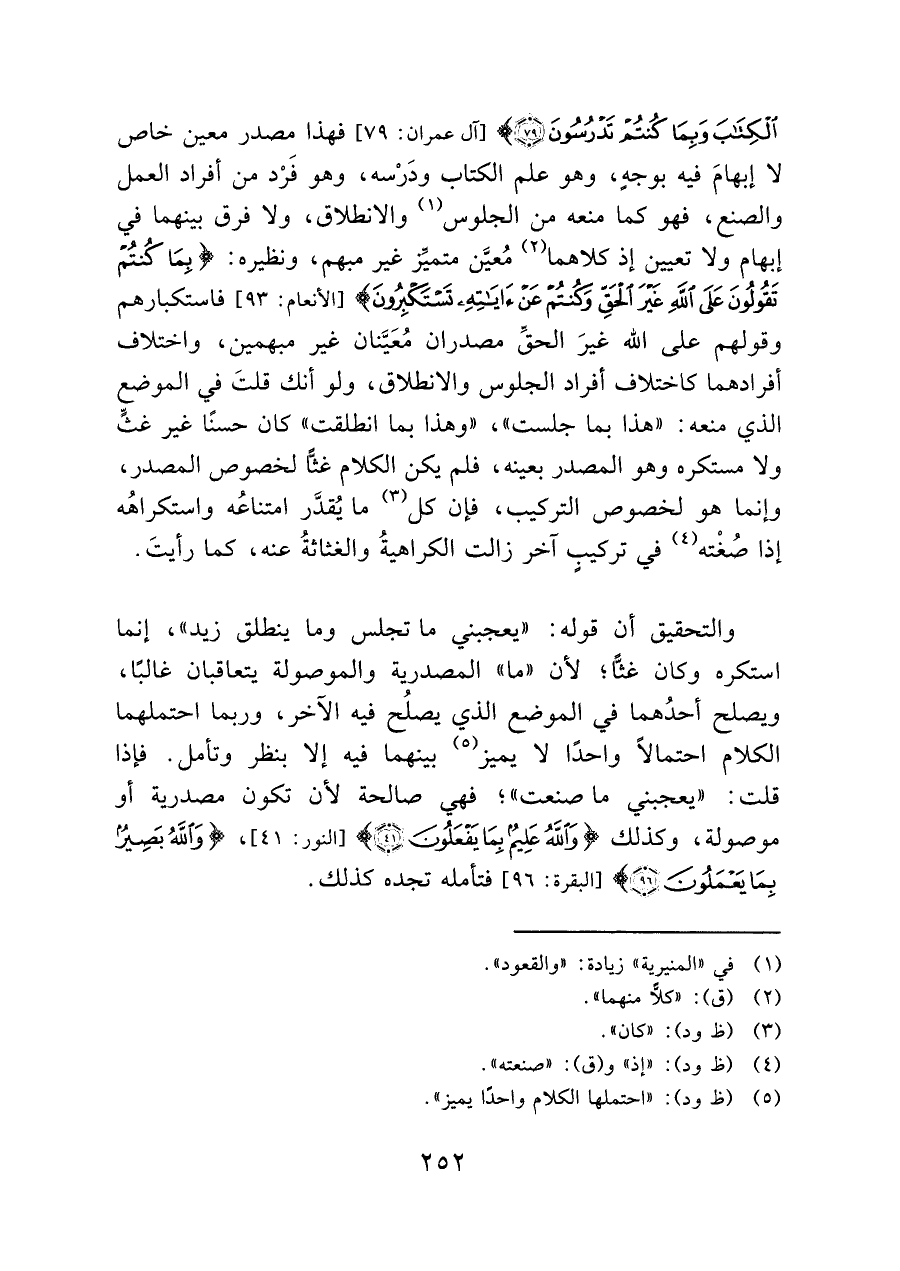الْكِتَابَ وَبِمَا كُنْتُمْ تَدْرُسُونَ (٧٩)} [آل عمران: ٧٩] فهذا مصدر معين خاص لا إبهامَ فيه بوجهٍ، وهو علم الكتاب ودَرْسه، وهو فَرْد من أفراد العمل والصنع، فهو كما منعه من الجلوس (¬١) والانطلاق، ولا فرق بينهما في إبهام ولا تعيين إذ كلاهما (¬٢) مُعيَّن متميِّز غير مبهم، ونظيره: {بِمَا كُنْتُمْ تَقُولُونَ عَلَى اللَّهِ غَيْرَ الْحَقِّ وَكُنْتُمْ عَنْ آيَاتِهِ تَسْتَكْبِرُونَ} [الأنعام: ٩٣] فاستكبارهم وقولهم على الله غيرَ الحقِّ مصدران مُعَيَّنان غير مبهمين، واختلاف أفرادهما كاختلاف أفراد الجلوس والانطلاق، ولو أنك قلتَ في الموضع الذي منعه: "هذا بما جلست"، "وهذا بما انطلقت" كان حسنًا غير غثٍّ ولا مستكره وهو المصدر بعينه، فلم يكن الكلام غثًّا لخصوص المصدر، وإنما هو لخصوص التركيب، فإن كل (¬٣) ما يُقدَّر امتناعُه واستكراهُه إذا صُغْته (¬٤) في تركيبٍ: آخر زالت الكراهيةُ والغثاثةُ عنه، كما رأيتَ.