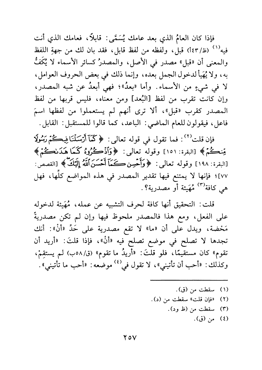 فإن قلت (¬٢): فما تقول في قوله تعالى: {كَمَا أَرْسَلْنَا فِيكُمْ رَسُولًا مِنْكُمْ} [البقرة: ١٥١] وقوله تعالى: {وَاذْكُرُوهُ كَمَا هَدَاكُمْ} [البقرة: ١٩٨] وقوله تعالى: {وَأَحْسِنْ كَمَا أَحْسَنَ اللَّهُ} [القصص: ٧٧]؛ فإنها لا يمتنع فيها تقدير المصدر في هذه المواضع كلِّها، فهل هي كافة (¬٣) مُهَيئة أو مصدرية؟.