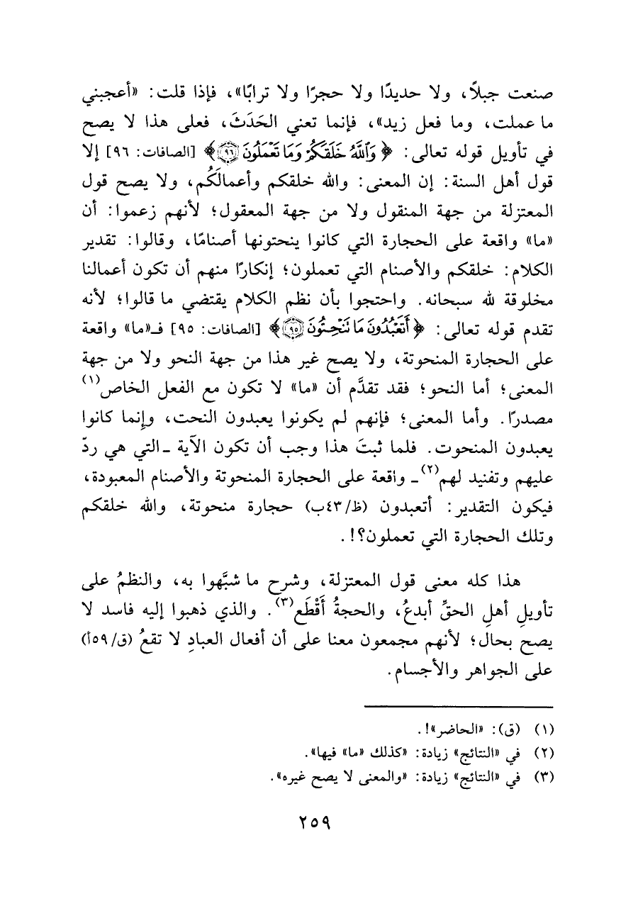 صنعت جبلًا، ولا حديدًا ولا حجرًا ولا ترابًا"، فإذا قلت: "أعجبني ما عملت، وما فعل زيد"، فإنما تعني الحَدَثَ، فعلى هذا لا يصح في تأويل قوله تعالى: {وَاللَّهُ خَلَقَكُمْ وَمَا تَعْمَلُونَ (٩٦)} [الصافات: ٩٦] إلا قول أهل السنة: إن المعنى: والله خلقكم وأعمالَكُم، ولا يصح قول المعتزلة من جهة المنقول ولا من جهة المعقول؛ لأنهم زعموا: أن "ما" واقعة على الحجارة التي كانوا ينحتونها أصنامًا، وقالوا: تقدير الكلام: خلقكم والأصنام التي تعملون، إنكارًا منهم أن تكون أعمالنا مخلوقة لله سبحانه. واحتجوا بأن نظم الكلام يقتضي ما قالوا؛ لأنه تقدم قوله تعالى: {أَتَعْبُدُونَ مَا تَنْحِتُونَ} [الصافات: ٩٥] فـ "ما" واقعة على الحجارة المنحوتة، ولا يصح غير هذا من جهة النحو ولا من جهة المعنى؛ أما النحو؛ فقد تقدَّم أن "ما" لا تكون مع الفعل الخاص (¬١) مصدرًا. وأما المعنى؛ فإنهم لم يكونوا يعبدون النحت، وإِنما كانوا يعبدون المنحوت. فلما ثبتَ هذا وجب أن تكون الآية -التي هي ردّ عليهم وتفنيد لهم (¬٢) - واقعة على الحجارة المنحوتة والأصنام المعبودة، فيكون التقدير: أتعبدون (ظ/٤٣ ب) حجارة منحوتة، والله خلقكم وتلك الحجارة التي تعملون؟!.