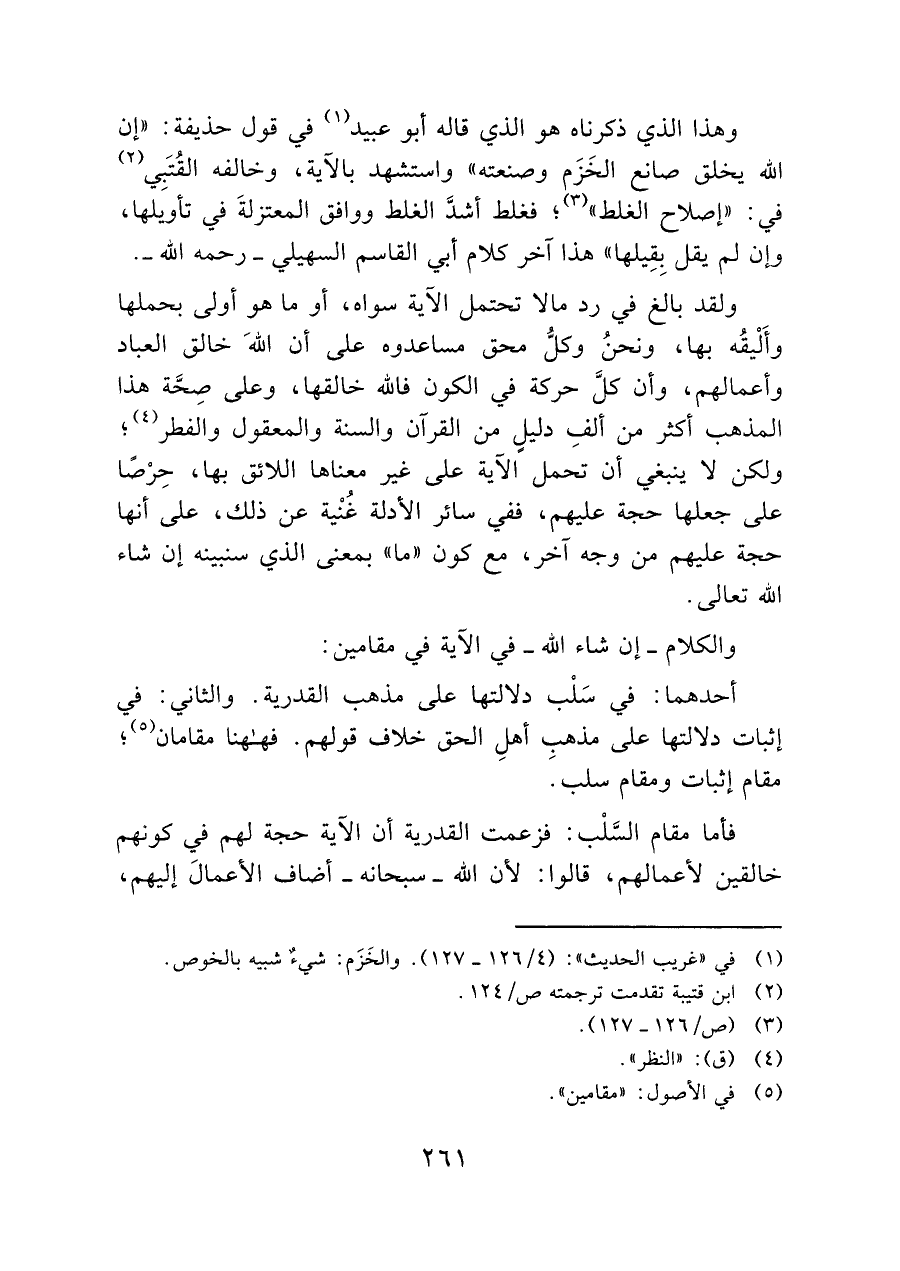 وهذا الذي ذكرناه هو الذي قاله أبو عبيد (¬١) في قول حذيفة: "إن الله يخلق صانع الخَزَم وصنعته" واستشهد بالآية، وخالفه القُتَبِي (¬٢) في "إصلاح الغلط" (¬٣)؛ فغلط أشدَّ الغلط ووافق المعتزلةَ في تأويلها، وإن لم يقل بِقِيلها" هذا آخر كلام أبي القاسم السهيلي -رحمه الله-.