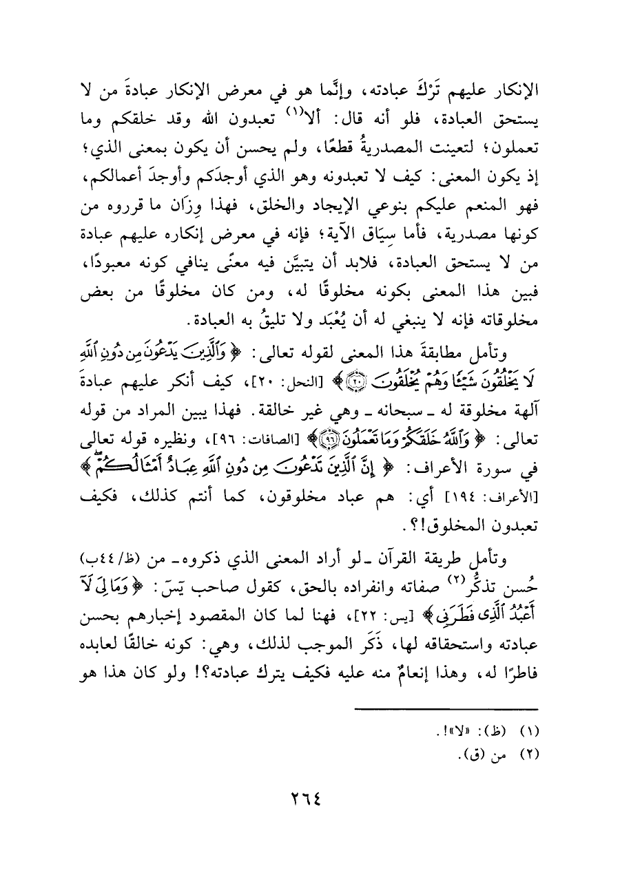 وتأمل مطابقةَ هذا المعنى لقوله تعالى: {وَالَّذِينَ يَدْعُونَ مِنْ دُونِ اللَّهِ لَا يَخْلُقُونَ شَيْئًا وَهُمْ يُخْلَقُونَ (٢٠)} [النحل: ٢٠]، كيف أنكر عليهم عبادةَ آلهة مخلوقة له -سبحانه- وهي غير خالقة. فهذا يبين المراد من قوله تعالى: {وَاللَّهُ خَلَقَكُمْ وَمَا تَعْمَلُونَ (٩٦)} [الصافات: ٩٦]، ونظيره قوله تعالى في سورة الأعراف: {إِنَّ الَّذِينَ تَدْعُونَ مِنْ دُونِ اللَّهِ عِبَادٌ أَمْثَالُكُمْ} [الأعراف: ١٩٤] أي: هم عباد مخلوقون، كما أنتم كذلك، فكيف تعبدون المخلوق!؟.