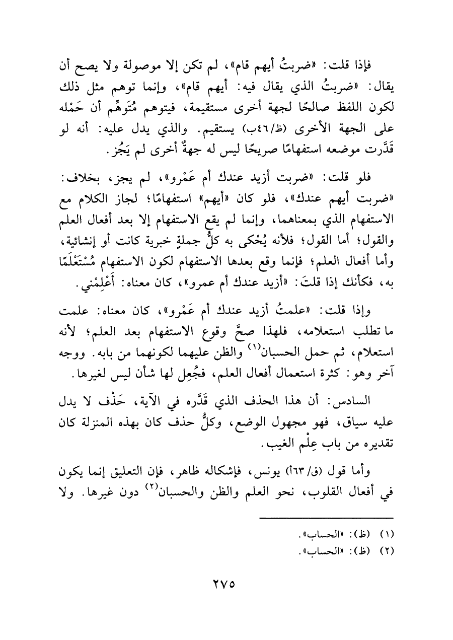 فلو قلت: "ضربت أزيد عندك أم عَمْرو"، لم يجز، بخلاف: "ضربت أيهم عندك"، فلو كان "أيهم" استفهامًا" لجاز الكلام مع الاستفهام الذىِ بمعناهما، وإنما لم يقع الاستفهام إلا بعد أفعال العلم والقول؛ أما القول؛ فلأنه يُحْكى به كلُّ جملةٍ خبرية كانت أو إنشائية، وأما أفعال العلم! فإنما وقع بعدها الاستفهام لكون الاستفهام مُسْتَعْلَمًا به، فكأنك إذا قلتَ: "أريد عندك أم عمرو"، كان معناه: أَعْلِمْني.