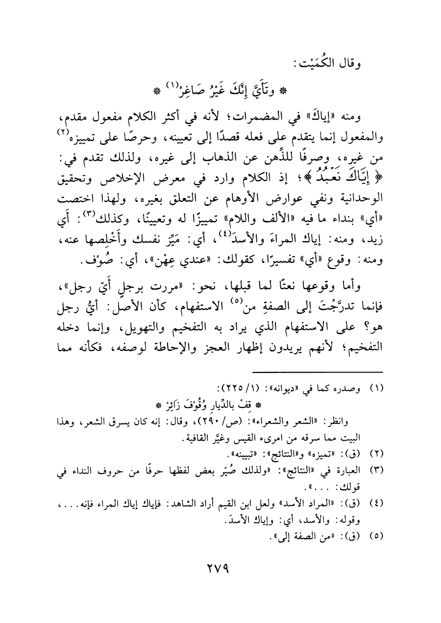 ومنه "إياكَ" في المضمرات، لأنه في أكثر الكلام مفعول مقدم، والمفعول إنما يتقدم على فعله قصدًا إلى تعيينه، وحرصًا على تمييزه (¬٢) من غيره، وصرفًا للذِّهن عن الذهاب إلى غيره، ولذلك تقدم في: {إِيَّاكَ نَعْبُدُ}؛ إذ الكلام وارد في معرض الإخلاص وتحقيق الوحدانية ونفي عوارض الأوهام عن التعلق بغيره، ولهذا اختصت "أي" بنداء ما فيه "الألف واللام" تمييزًا له وتعيينًا، وكذلك (¬٣): أَي زيد، ومنه: إياك المراءَ والأسدَ (¬٤)، أي: مَيِّز نفسك وأَخْلصها عنه، ومنه: وقوع "أي" تفسيرًا، كقولك: "عندي عِهن"، أي: صُوْف.