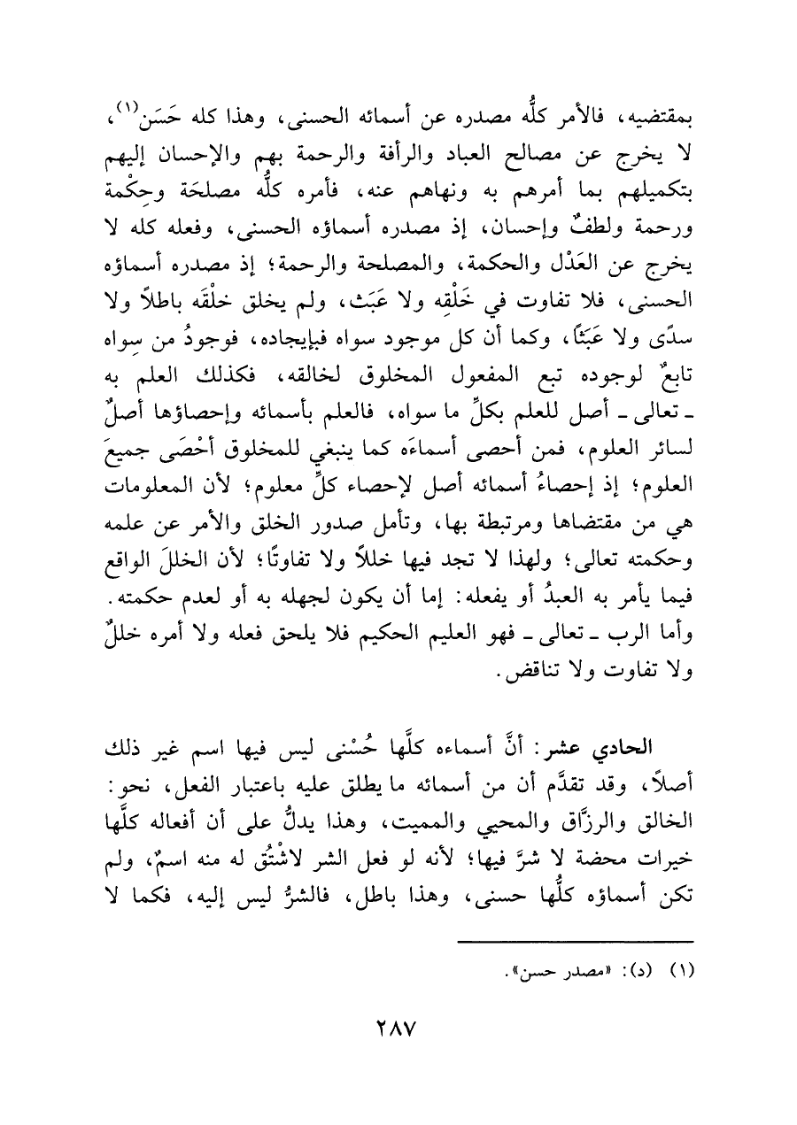 بمقتضيه، فالأمر كلُّه مصدره عن أسمائه الحسنى، وهذا كله حَسَن (¬١)، لا يخرج عن مصالح العباد والرأفة والرحمة بهم والإحسان إليهم بتكميلهم بما أمرهم به ونهاهم عنه، فأمره كلُّه مصلحَة وحِكْمة ورحمة ولطفٌ وإحسان، إذ مصدره أسماؤه الحسنى، وفعله كله لا يخرج عن العَدْل والحكمة، والمصلحة والرحمة، إذ مصدره أسماؤه الحسنى، فلا تفاوت في خَلْقِه ولا عَبَث، ولم يخلق خلْقَه باطلًا ولا سدًى ولا عَبَثًا، وكما أن كل موجود سواه فبإيجاده، فوجود من سِواه تابعٌ لوجوده تبع المفعول المخلوق لخالقه، فكذلك العلم به -تعالى- أصل للعلم بكلِّ ما سواه، فالعلم بأسمائه وإحصاؤها أصل لسائر العلوم، فمن أحصى أسماءَه كما ينبغي للمخلوق أحْصَى جميعَ العلوم؛ إذ إحصاءُ أسمائه أصل لإحصاء كلِّ معلوم؛ لأن المعلومات هي من مقتضاها ومرتبطة بها، وتأمل صدور الخلق والأمر عن علمه وحكمته تعالى؛ ولهذا لا تجد فيها خللًا ولا تفاوتًا، لأن الخللَ الواقع فيما يأمر به العبدُ أو يفعله: إما أن يكون لجهله به أو لعدم حكمته. وأما الرب -تعالى- فهو العليم الحكيم فلا يلحق فعله ولا أمره خللٌ ولا تفاوت ولا تناقض.