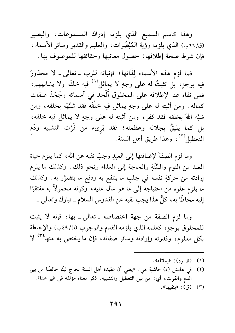 (¬٢) في هامش (د) حاشية: هي: "يعني أن عقيدة أهل السنة تخرج لبنًا خالصًا من بين الدم والفرث، أي: من بين التعطيل والتشبيه. ذكر معناه مؤلفه في غير هذا".