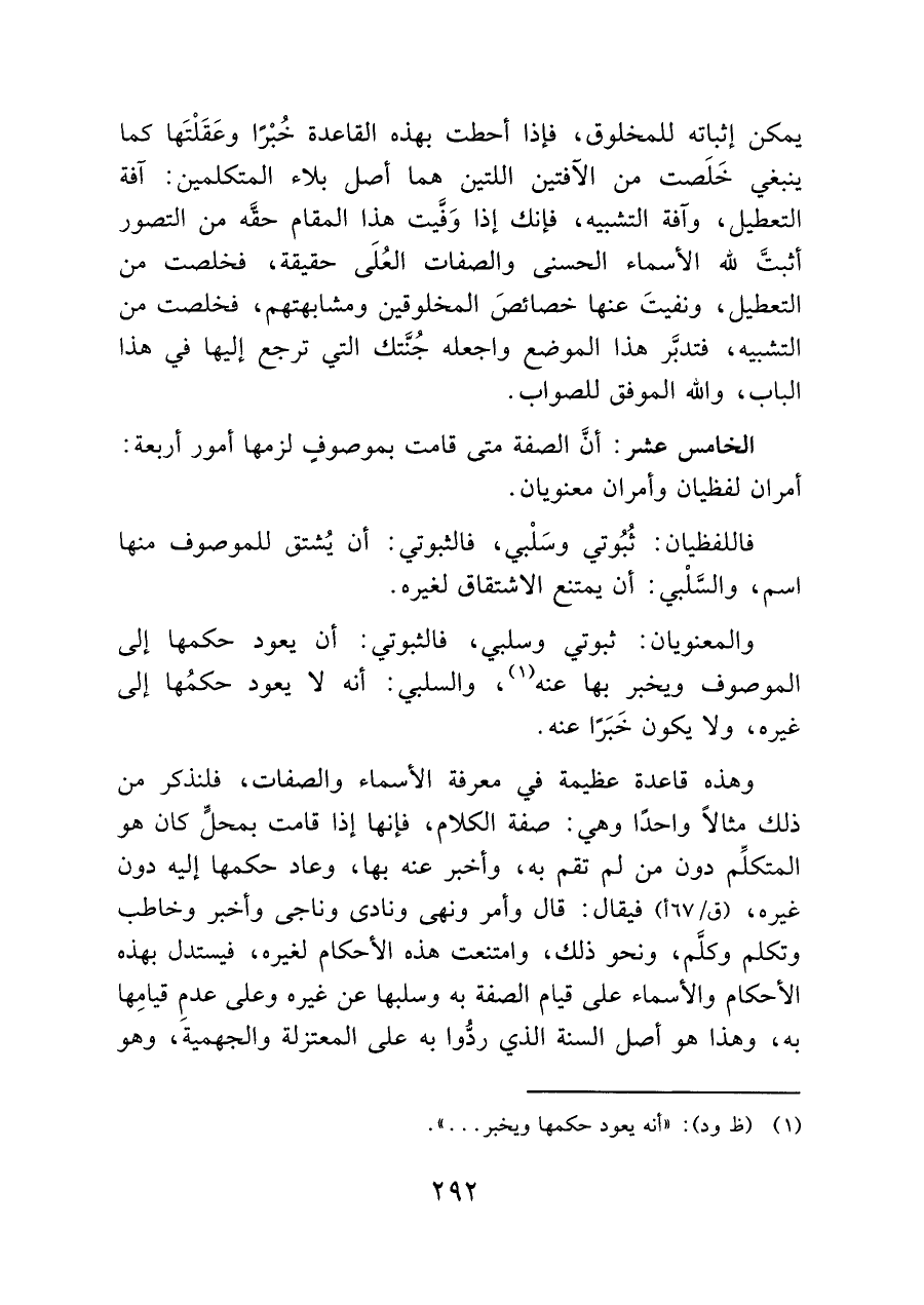 يمكن إثباته للمخلوق، فإذا أحطت بهذه القاعدة خُبْرًا وعَقَلْتَها كما ينبغي خَلَصت من الآفتين اللتين هما أصل بلاء المتكلمين: آفة التعطيل، وآفة التشبيه، فإنك إذا وَفَّيت هذا المقام حقَّه من التصور أثبتَّ لله الأسماء الحسنى والصفات العُلَى حقيقة، فخلصت من التعطيل، ونفيتَ عنها خصائصَ المخلوقين ومشابهتهم، فخلصت من التشبيه، فتدبَّر هذا الموضع واجعله جُنَّتك التي ترجع إليها في هذا الباب، والله الموفق للصواب.
