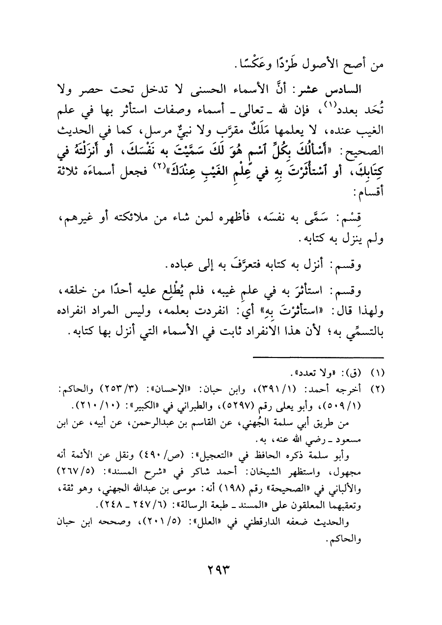 السادس عشر: أنَّ الأسماء الحسنى لا تدخل تحت حصر ولا تُحَد بعدد (¬١)، فإن لله -تعالى- أسماء وصفات استأثر بها في علم الغيب عنده، لا يعلمها مَلَكٌ مقرَّب ولا نبيٌّ مرسل، كما في الحديث الصحيح: "أسْألُكَ بِكُلِّ اسْمٍ هُوَ لَكَ سَمَّيْتَ به نَفْسَكَ، أو أَنزَلْتَه في كتَابِكَ، أو أسْتأْثَرْتَ بهِ في عِلْمِ الغَيْبِ عِنْدَكَ" (¬٢) فجعل أسماءَه ثلاثة أقسَام: