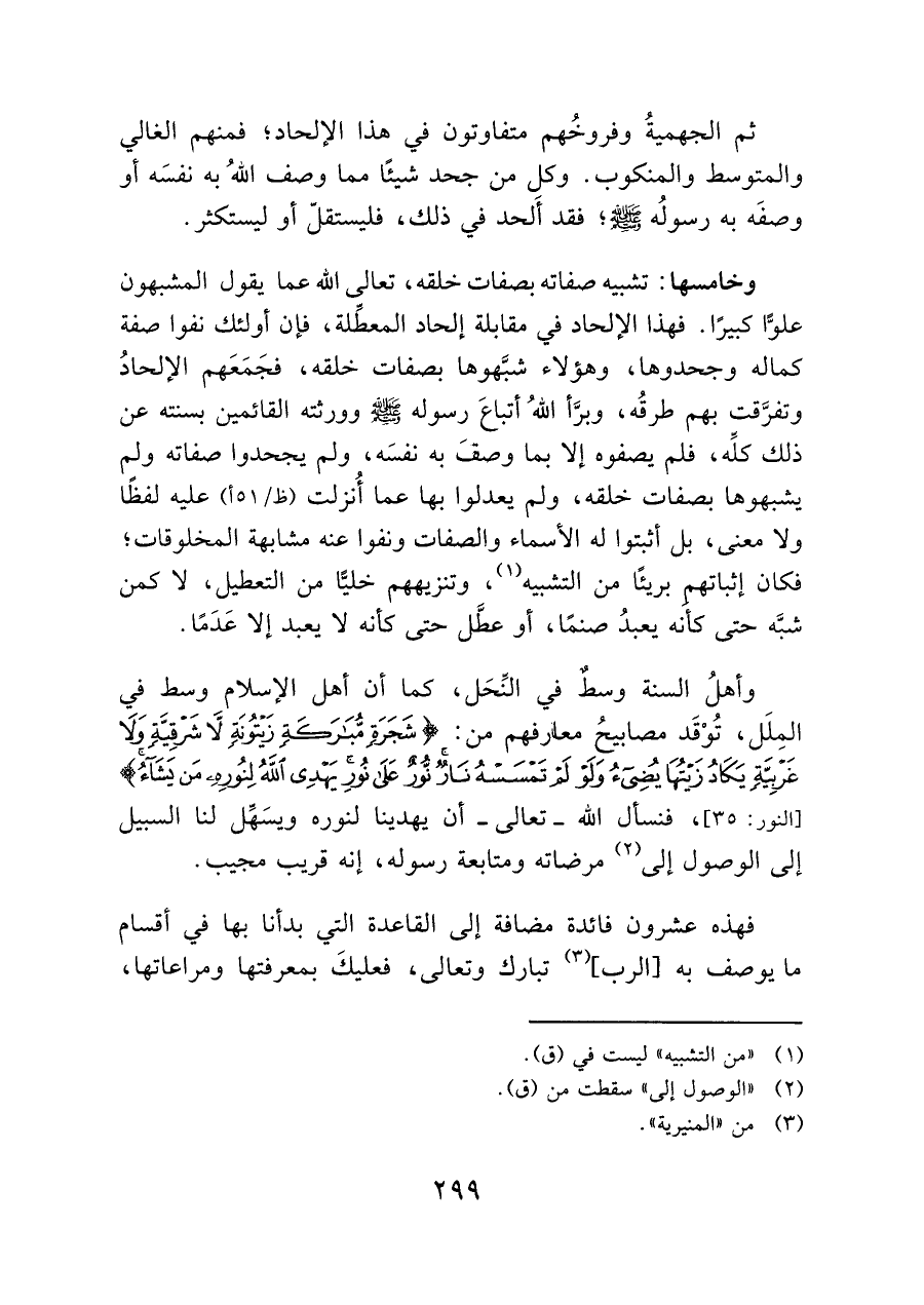 وأهلُ السنة وسطٌ في النِّحَل، كما أن أهل الإسلام وسط في المِلَل، تُوْقَد مصابيحُ معارفهم من: {شَجَرَةٍ مُبَارَكَةٍ زَيْتُونَةٍ لَا شَرْقِيَّةٍ وَلَا غَرْبِيَّةٍ يَكَادُ زَيْتُهَا يُضِيءُ وَلَوْ لَمْ تَمْسَسْهُ نَارٌ نُورٌ عَلَى نُورٍ يَهْدِي اللَّهُ لِنُورِهِ مَنْ يَشَاءُ} [النور: ٣٥]، فتسأل الله -تعالى- أن يهدينا لنوره ويسَهِّل لنا السبيل إلى الوصول إلى (¬٢) مرضاته ومتابعة رسوله، إنه قريب مجيب.