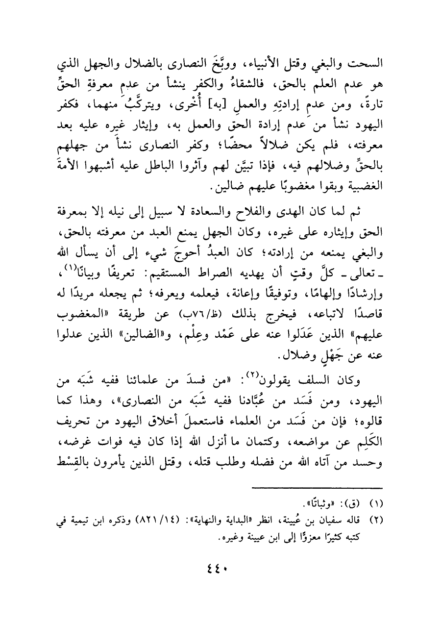 السحت والبغي وقتل الأنبياء، ووبَّخَ النصارى بالضلال والجهل الذي هو عدم العلم بالحق، فالشقاءُ والكفر ينشأ من عدمِ معرفةِ الحقِّ تارةً، ومن عدمِ إرادتِهِ والعملِ [به] أُخْرى، ويتركَّبُ منهما، فكفر اليهود نشأ من عدم إرادة الحق والعمل به، وإيثار غيره عليه بعد معرفته، فلم يكن ضلالًا محضًا؛ وكفر النصارى نشأَ من جهلهم بالحقِّ وضلالهم فيه، فإذا تبيَّن لهم وآثروا الباطل عليه أشبهوا الأمةَ الغضبية وبقوا مغضوبًا عليهم ضالين.