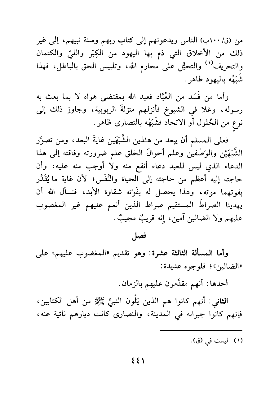 فعلى المسلم أن يبعد من هذين الشَّبَهَين غايةَ البعد، ومن تصوَّر الشَّبَهَيْن والوَصْفين وعلم أحوالَ الخلق علم ضرورته وفاقته إلى هذا الدعاء الذي ليس للعبد دعاء أنفع منه ولا أوجب منه عليه، وأن حاجته إليه أعظم من حاجته إلى الحياة والنَّفَس؛ لأن غاية ما يُقَدَّر بفوتهما موته، وهذا يحصل له بفَوْته شقاوة الأبد، فنسأل الله أن يهدينا الصراطَ المستقيم صراط الذين أنعم عليهم غير المغضوب عليهم ولا الضالين آمين، إِنه قريبٌ مجيبٌ.