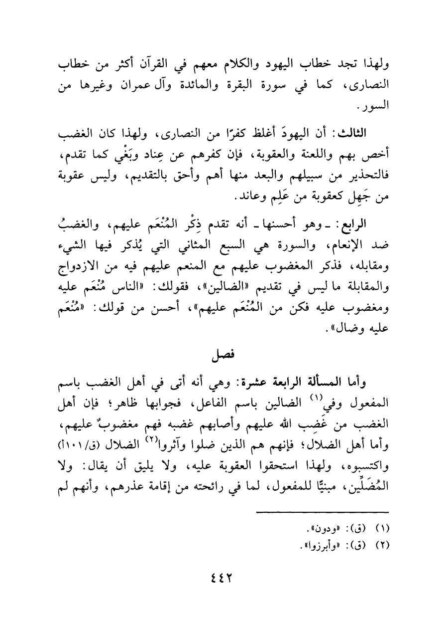 وأما المسألة الرابعة عشرة: وهي أنه أتى في أهل الغضب باسم المفعول وفي (¬١) الضالين باسم الفاعل، فجوابها ظاهر؛ فإن أهل الغضب من غَضِب الله عليهم وأصابهم غضبه فهم مغضوبٌ عليهم، وأما أهل الضلال؛ فإنهم هم الذين ضلوا وآثروا (¬٢) الضلال واكتسبوه، ولهذا استحقوا العقوبة عليه، ولا يليق أن يقال: ولا المُضَلِّين، مبنيًّا للمفعول، لما في رائحته من إقامة عذرهم، وأنهم لم