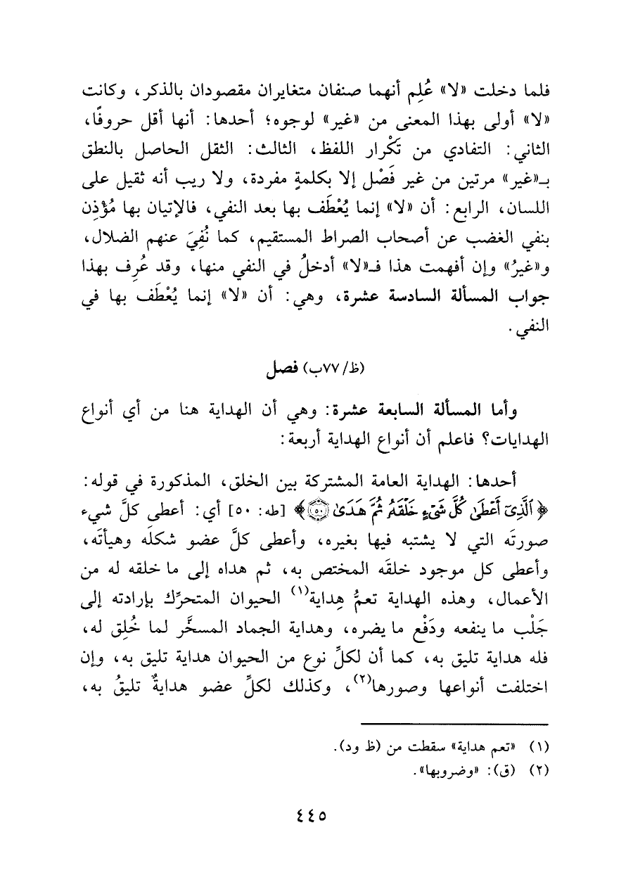 فلما دخلت "لا" عُلِم أنهما صنفان متغايران مقصودان بالذكر، وكانت "لا" أولى بهذا المعنى من "غير" لوجوه؛ أحدها: أنها أقل حروفًا، الثاني: التفادي من تَكْرار اللفظ، الثالث: الثقل الحاصل بالنطق بـ "غير" مرتين من غير فَصْل إلا بكلمةٍ مفردة، ولا ريب أنه ثقيل على اللسان، الرابع: أن "لا" إنما يُعْطَف بها بعد النفي، فالإتيان بها مُؤْذِن بنفي الغضب عن أصحاب الصراط المستقيم، كما نُفِيَ عنهم الضلال، و"غيرُ" وإن أفهمت هذا فـ "لا" أدخلُ في النفي منها، وقد عُرِف بهذا جواب المسألة السادسة عشرة، وهي: أن "لا" إنما يُعْطَف بها في النفي.