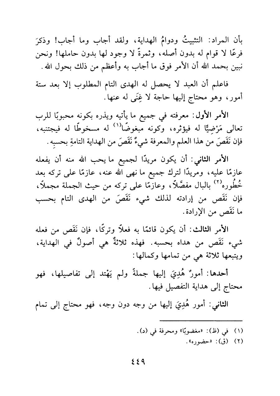الأمر الثالث: أن يكون قائمًا به فعلًا وتركًا، فإن نَقَص من فعله شيء نَقَص من هداه بحسبه. فهذه ثلاثةٌ هي أصولٌ في الهداية، ويتبعها ثلاثة هي من تمامها وكمالها: