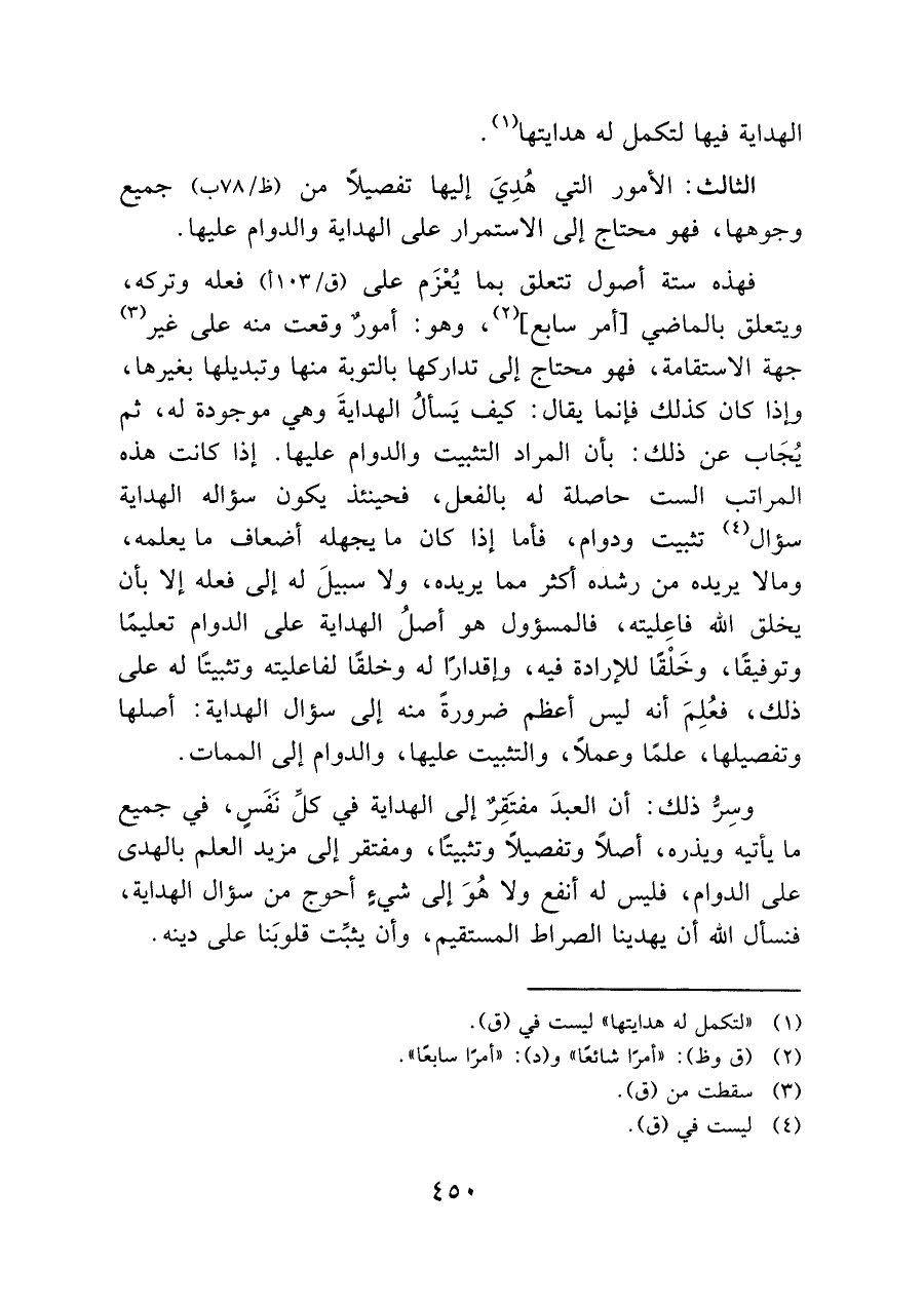 الثالث: الأمور التي هُدِيَ إليها تفصيلًا من جميع وجوهها، فهو محتاج إلى الاستمرار على الهداية والدوام عليها.