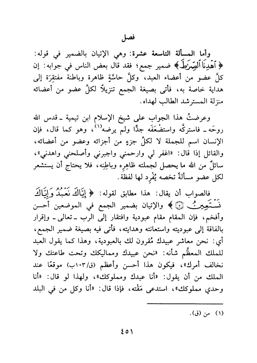 فالصواب أن يقال: هذا مطابق لقوله: {إِيَّاكَ نَعْبُدُ وَإِيَّاكَ نَسْتَعِينُ (٥)} والإتيان بضمير الجمع في الموضعين أحسن وأفخم، فإن المقام مقام عبودية وافتقار إلى الرب -تعالى- وإقرار بالفاقة إلى عبودية واستعانته وهدايته، فأتى فيه بصيغة ضمير الجمع، أي: نحن معاشر عبيدك مُقرون لك بالعبودية، وهذا كما يقول العبد للملك المعظَّم شأنه: "نحن عبيدك ومماليكك وتحت طاعتك ولا نخالف أمرك"، فيكون هذا أحسن وأعظم موقعًا عند الملك من أن يقول: "أنا عبدك ومملوكك"، ولهذا لو قال: "أنا وحدي مملوكك"، استدعى مَقْته، فإذا قال: "أنا وكل من في البلد