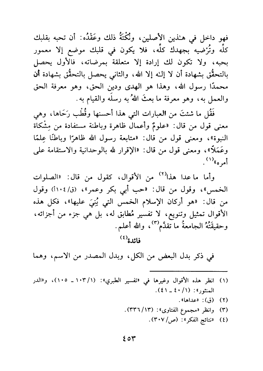فَقُل ما شئتَ من العبارات التي هذا أحسنها وقُطْب رَحَاها، وهي معنى قول من قال: "علومٌ وأعمال ظاهرة وباطنة مستفادة من مِشْكاة النبوة"، ومعنى قول من قال: "متابعة رسول الله ظاهرًا وباطنًا عِلمًا وعَمَلًا"، ومعنى قول من قال: "الإقرار لله بالوحدانية والاستقامة على أمره" (¬١).