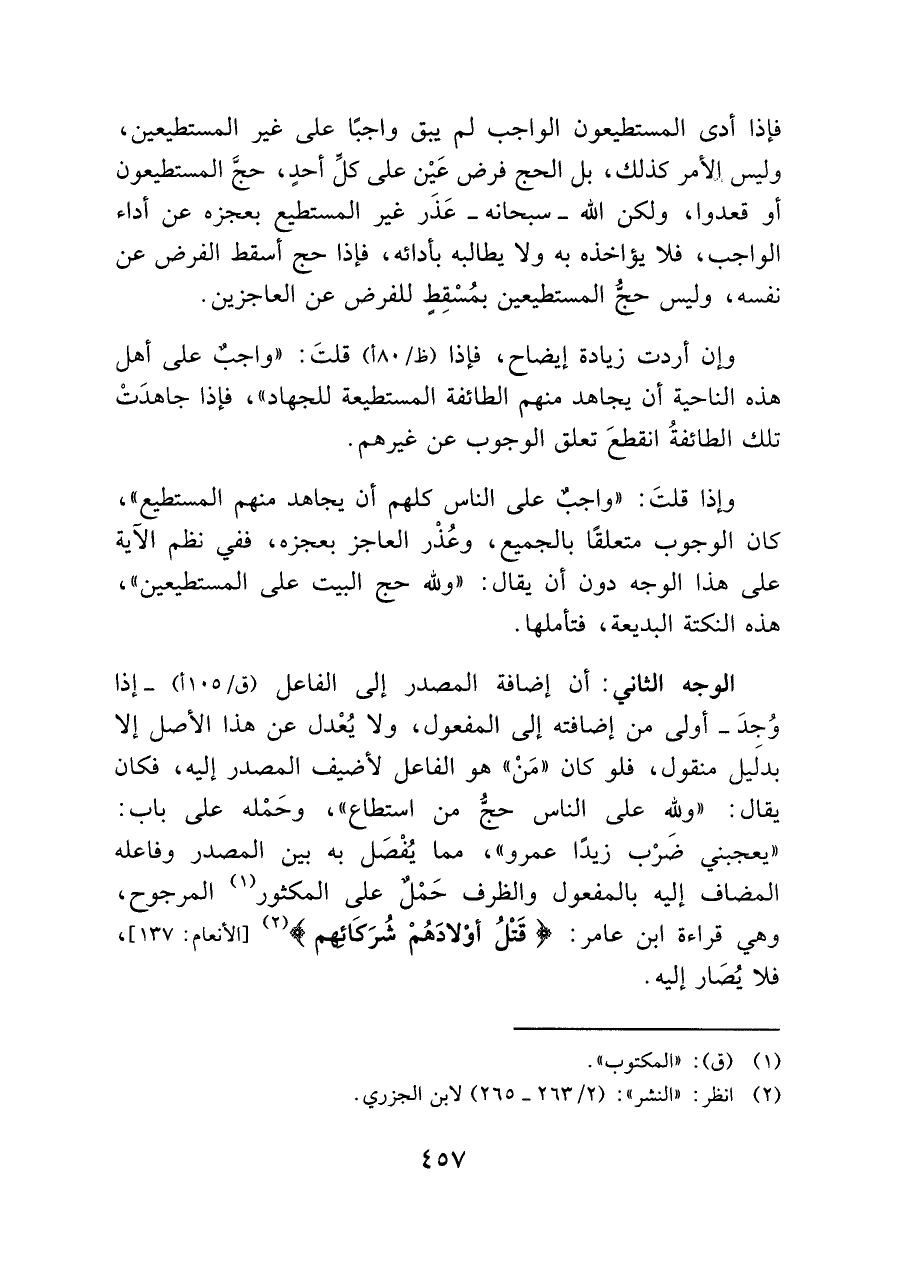 الوجه الثاني: أن إضافة المصدر إلى الفاعل -إذا وُجِدَ- أولى من إضافته إلى المفعول، ولا يُعْدل عن هذا الأصل إلا بدلَيل منقول، فلو كان "مَنْ" هو الفاعل لأضيف المصدر إليه، فكان يقال: "ولله على الناس حجُّ من استطاع"، وحَمْله على باب: "يعجبني ضَرْب زيدًا عمرو"، مما يُفْصَل به بين المصدر وفاعله المضاف إليه بالمفعول والظرف حَمْلٌ على المكثور (¬١) المرجوح، وهي قراءة ابن عامر: {قَتْلَ أَوْلَادِهِمْ شُرَكَاؤُهُمْ} (¬٢) [الأنعام: ١٣٧]، فلا يُصَار إليه.