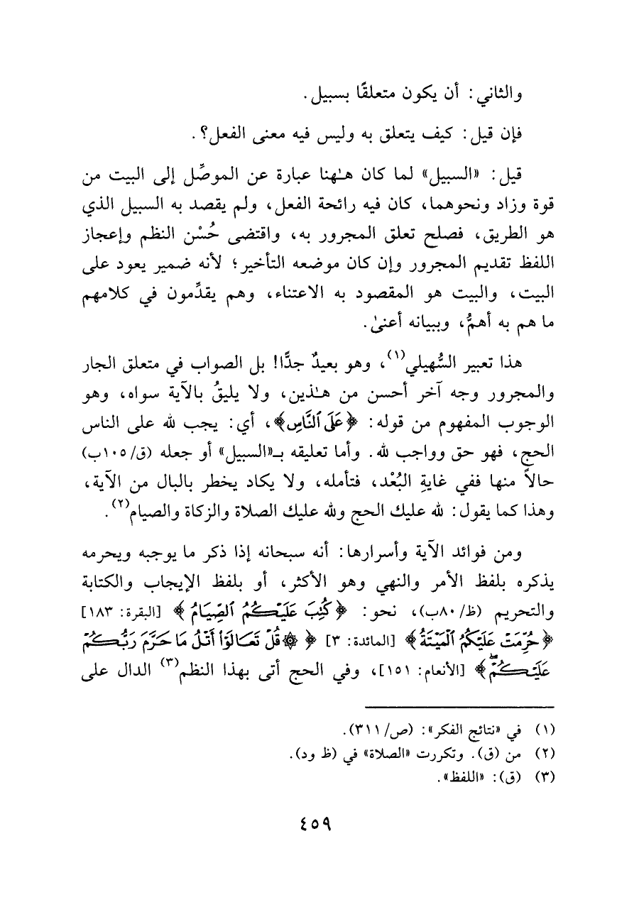هذا تعبير السُّهيلي (¬١)، وهو بعيدٌ جدًّا! بل الصواب في متعلق الجار والمجرور وجه آخر أحسن من هذين، ولا يليقُ بالآية سواه، وهو الوجوب المفهوم من قوله: {عَلَى النَّاسِ}، أي: يجب لله على الناس الحج، فهو حق وواجب لله. وأما تعليقه بـ "السبيل" أو جعله حالًا منها ففي غايةِ البُعْد، فتأمله، ولا يكاد يخطر بالبال من الآية، وهذا كما يقول: لله عليك الحج ولله عليك الصلاة والزكاة والصيام (¬٢).