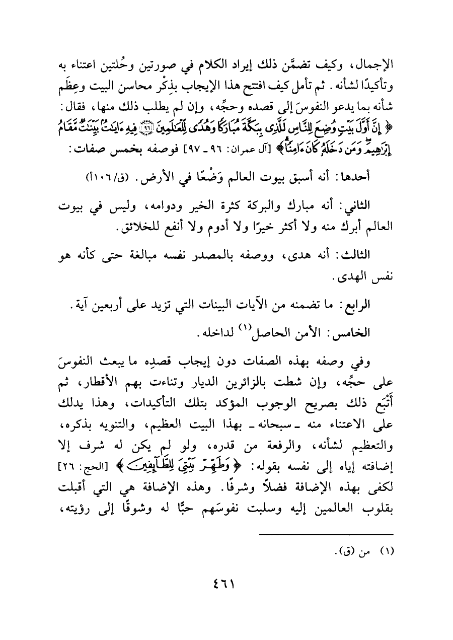 الإجمال، وكيف تضمَّن ذلك إيراد الكلام في صورتين وحُلتين اعتناء به وتأكيدًا لشأنه. ثم تأمل كيف افتتح هذا الإيجاب بذِكْر محاسن البيت وعِظَم شأنه بما يدعو النفوسَ إلى قصده وحجِّه، وإن لم يطلب ذلك منها، فقال: {إِنَّ أَوَّلَ بَيْتٍ وُضِعَ لِلنَّاسِ لَلَّذِي بِبَكَّةَ مُبَارَكًا وَهُدًى لِلْعَالَمِينَ (٩٦) فِيهِ آيَاتٌ بَيِّنَاتٌ مَقَامُ إِبْرَاهِيمَ وَمَنْ دَخَلَهُ كَانَ آمِنًا} [آل عمران: ٩٦ - ٩٧] فوصفه بخمس صفات: