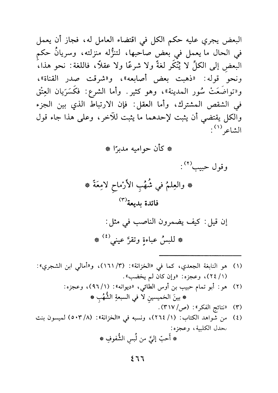 البعض يجري عليه حكم الكل في اقتضاء العامل له، فجاز أن يعمل في الحال ما يعمل في بعض صاحبها، لتنزُّله منزلته، وسريانُ حكمِ البعض إلى الكلِّ لا يُنكَر لغةً ولا شرعًا ولا عقلاً، فاللغة: نحو هذا، ونحو قوله: "ذهبت بعض أصابعه"، و"شرقت صدر القناة"، و"تواضَعَتْ سُور المدينة"، وهو كثير. وأما الشرع: فكَسَريان العِتْق في الشقص المشترك، وأما العقل: فإن الارتباط الذي بين الجزء والكل يقتضي أن يثبت لإحدهما ما يثبت للآخر، وعلى هذا جاء قول الشاعر (¬١):