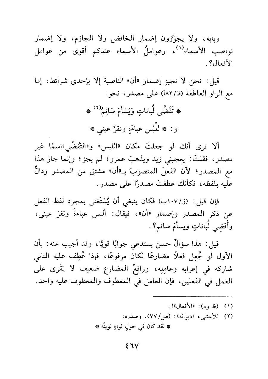 فإن قيل: (ق/ ١٠٧ ب) فكان ينبغي أن يُسْتَغنى بمجرد لفظ الفعل عن ذكر المصدر وإضمار "أن"، فيقال: ألبس عباءةً وتقرّ عيني، وأَقضِي لُباناتٍ ويسأمَ سائم؟.