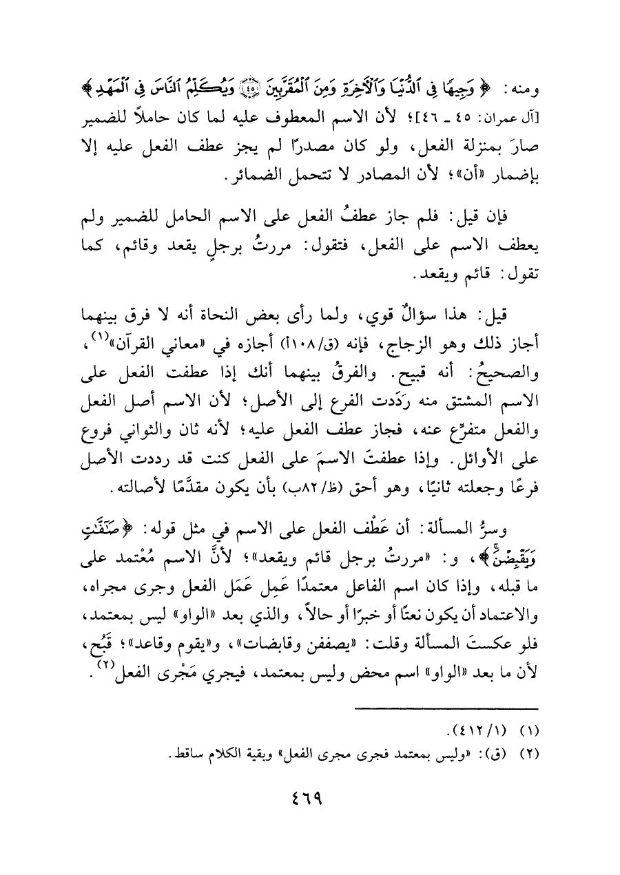 ومنه: {وَجِيهًا فِي الدُّنْيَا وَالْآخِرَةِ وَمِنَ الْمُقَرَّبِينَ (٤٥) وَيُكَلِّمُ النَّاسَ فِي الْمَهْدِ} [آل عمران: ٤٥ - ٤٦]} لأن الاسم المعطوف عليه لما كان حاملاً للضمير صارَ بمنزلة الفعل، ولو كان مصدرًا لم يجز عطف الفعل عليه إلا بإضمار "أن"؛ لأن المصادر لا تتحمل الضمائر.