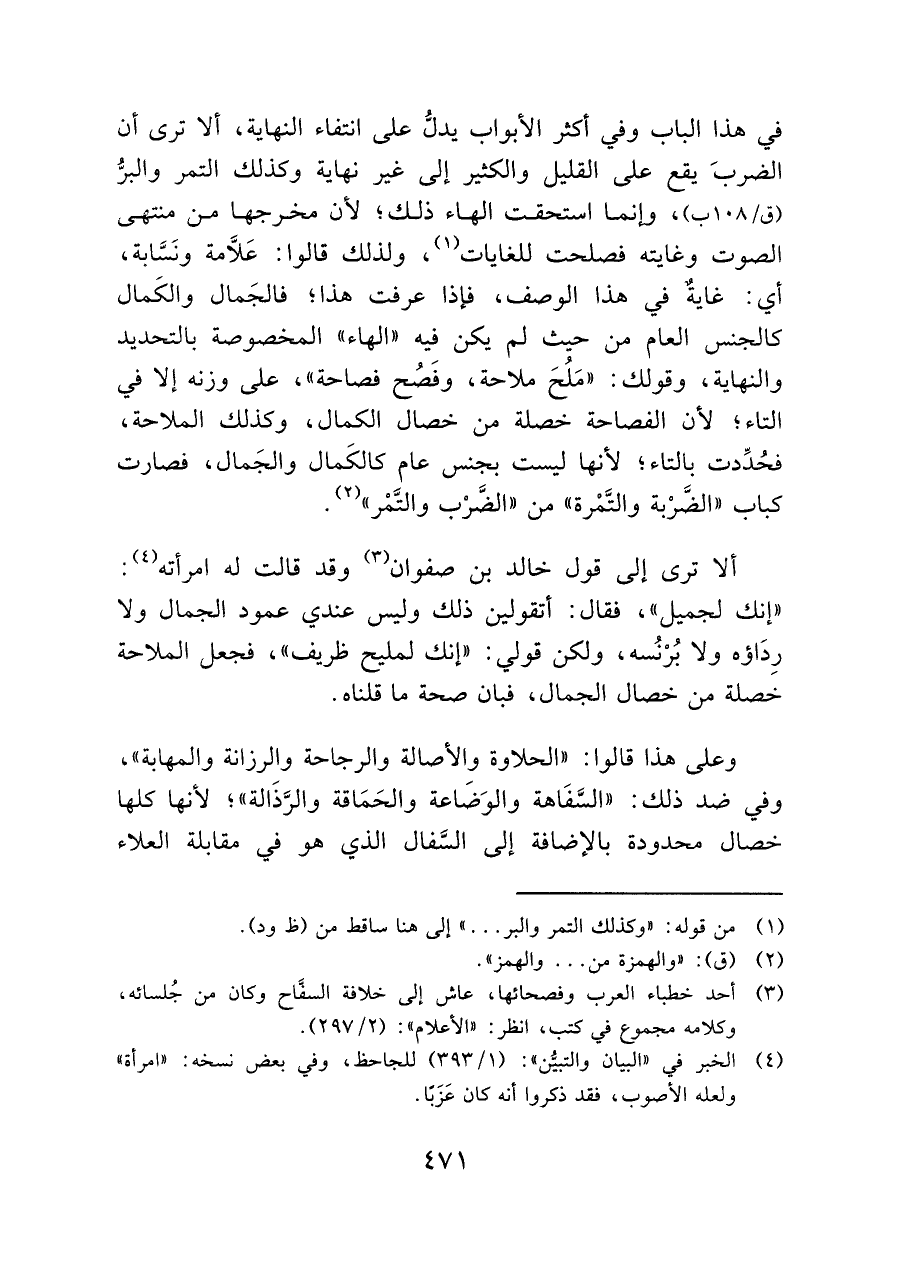 ألا ترى إلى قول خالد بن صفوان (¬٣) وقد قالت له امرأته (¬٤): "إنك لجميل"، فقال: أتقولين ذلك وليس عندي عمود الجمال ولا رِدَاؤه وبُرْنُسه، ولكن قولي: "إنك لمليح ظريف"، فجعل الملاحة خصلة من خصال الجمال، فبان صحة ما قلناه.