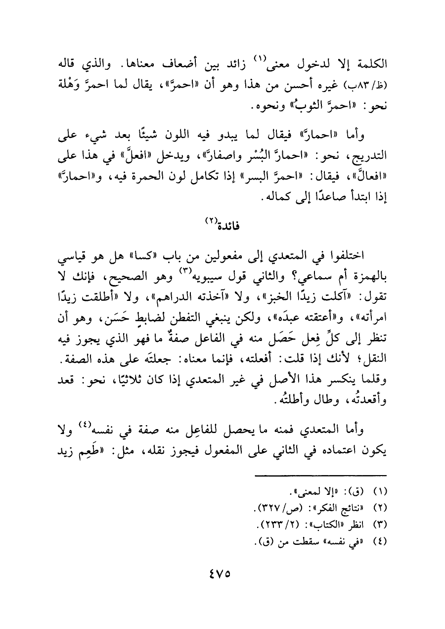 الكلمة إلا لدخول معنى (¬١) زائد بين أضعاف معناها. والذي قاله (ظ/٨٣ ب) غيره أحسن من هذا وهو أن "احمرَّ"، يقال لحا أحمرَّ وَهْلة نحو: "احمرَّ الثوبُ" ونحوه.