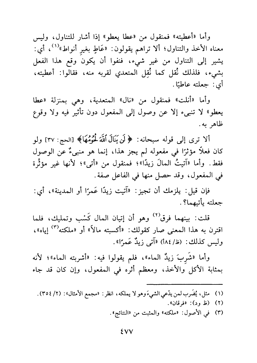 ألا ترى إلى قوله سبحانه: {لَنْ يَنَالَ اللَّهَ لُحُومُهَا} [الحج: ٣٧] ولو كان فعلاً مؤثرًا في مفعوله لم يجز هذا، إنما هو منبئٌ عن الوصول فقط. وأما "آتيتُ المالَ زيدًا"؛ فمنقول من "أتى"؛ لأنها غير مؤثِّرة فى المفعول، وقد حصل منها في الفاعل صفة.