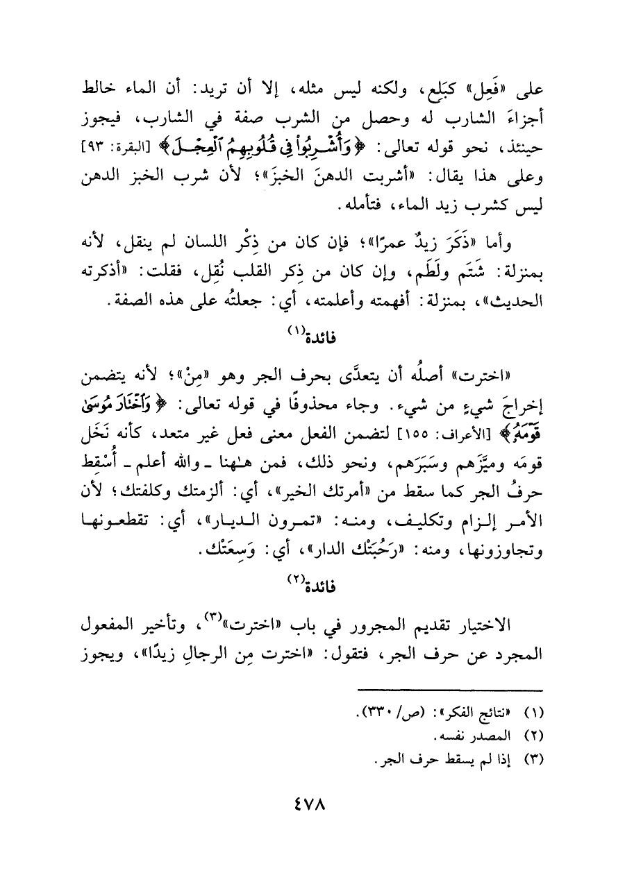 الاختيار تقديم المجرور في باب "اخترت" (¬٣)، وتأخير المفعول المجرد عن حرف الجر، فتقول: "اخترت مِن الرجالِ زيدًا"، ويجوز