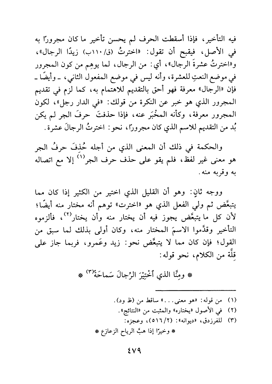 فيه التأخير، فإذا أسقطت الحرف لم يحسن تأخير ما كان مجرورًا به في الأصل، فيقبح أن تقول: "اخترتُ (ق/ ١١٠ ب) زيدًا الرجال"، و"اخترتُ عشرةَ الرجال"، أي: من الرجال، لما يوهِم من كون المجرور في موضع النعتِ للعشرة، وأنه ليس في موضع المفعول الثاني، -وأيضًا- فإن "الرجال" معرفة فهو أحق بالتقديم للاهتمام به، كلما لزم في تقديم المجرور الذي هو خبر عن النكرة من قولك: "في الدار رجل"، لكون المجرور معرفة، وكأنه المخْبَر عنه، فإذا حذفتَ حرفَ الجر لم يكن بُد من التقديم للاسم الذي كان مجرورًا، نحو: اخترتُ الرجالَ عشرة.