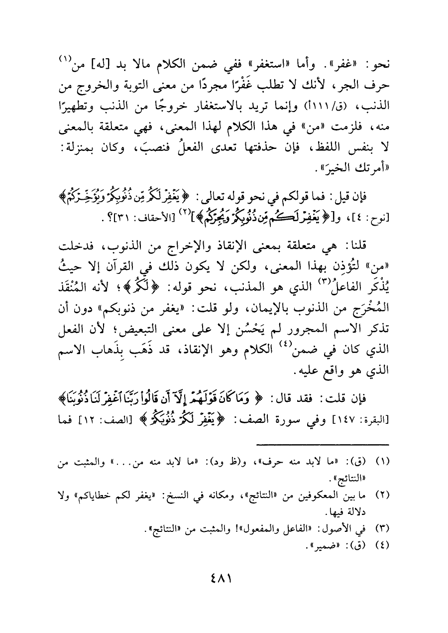 قلنا: هي متعلقة بمعنى الإنقاذ والإخراج من الذنوب، فدخلت "من" لتُؤذِن بهذا المعنى، ولكن لا يكون ذلك في القرآن إلا حيثُ يُذْكَر الفاعلُ (¬٣) الذي هو المذنب، نحو قوله: {لَكُم}؛ لأنه المُنْقَذ المُخْرَج من الذنوب بالإيمان، ولو قلت: "يغفر من ذنوبكم" دون أن تذكر الاسم المجرور لم يَحْسُن إلا على معنى التبعيض؛ لأن الفعل الذي كان في ضمن (¬٤) الكلام وهو الإنقاذ، قد ذَهَب بِذَهاب الاسم الذي هو واقع عليه.