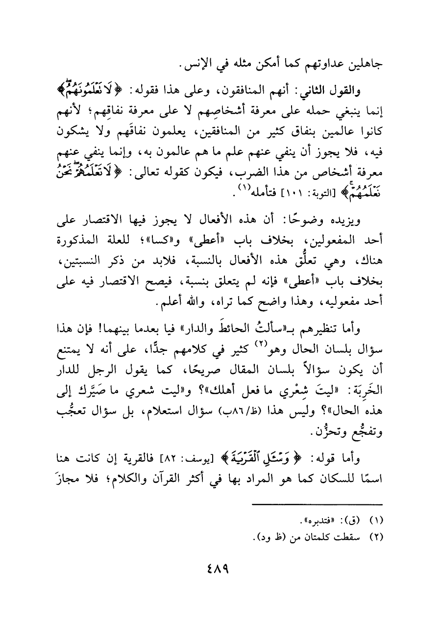 والقول الثاني: أنهم المنافقون، وعلى هذا فقوله: {لَا تَعْلَمُونَهُمُ} إنما ينبغي حمله على معرفة أشخاصِهم لا على معرفة نفاقِهم؛ لأنهم كانوا عالمين بنفاق كثير من المنافقين، يعلمون نفاقَهم ولا يشكون فيه، فلا يجوز أن ينفي عنهم علم ما هم عالمون به، وإنما ينفي عنهم معرفة أشخاص من هذا الضرب، فيكون كقوله تعالى: {لَا تَعْلَمُهُمْ نَحْنُ نَعْلَمُهُمْ} [التوبة: ١٠١] فتأمله (¬١).
