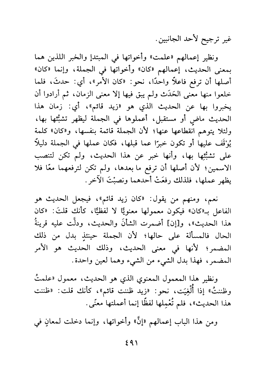 ونظير إعمالهم "علمت" وأخواتها في المبتدإ والخبر اللذين هما بمعنى الحديث، إعمالهم "كان" وأخواتها في الجملة، وإنما "كان" أصلها أن ترفع فاعلاً واحدًا، نحو: "كان الأمر"، أي: حدثَ، فلما خلعوا منها معنى الحَدَث ولم يبق فيها إلا معنى الزمان، ثم أرادوا أن يخبروا بها عن الحديث الذي هو "زيد قائم"، أي: زمان هذا الحديث ماضٍ أو مستقبل، أعملوها في الجملة ليظهر تشبُّثها بها، ولئلا يتوهم انقطاعها عنها؛ لأن الجملة قائمة بنفسها، و"كان" كلمة يُوْقَف عليها أو تكون خبرًا عما قبلها، فكان عملها في الجملة دليلًا على تشبُّثِها بها، وأنها خبر عن هذا الحديث، ولم تكن لتنصب الاسمين؛ لأن أصلها أن ترفع ما بعدها، ولم تكن لترفعهما معًا فلا يظهر عملها، فلذلك رفعَتْ أحدهما ونصبْتَ الآخر.