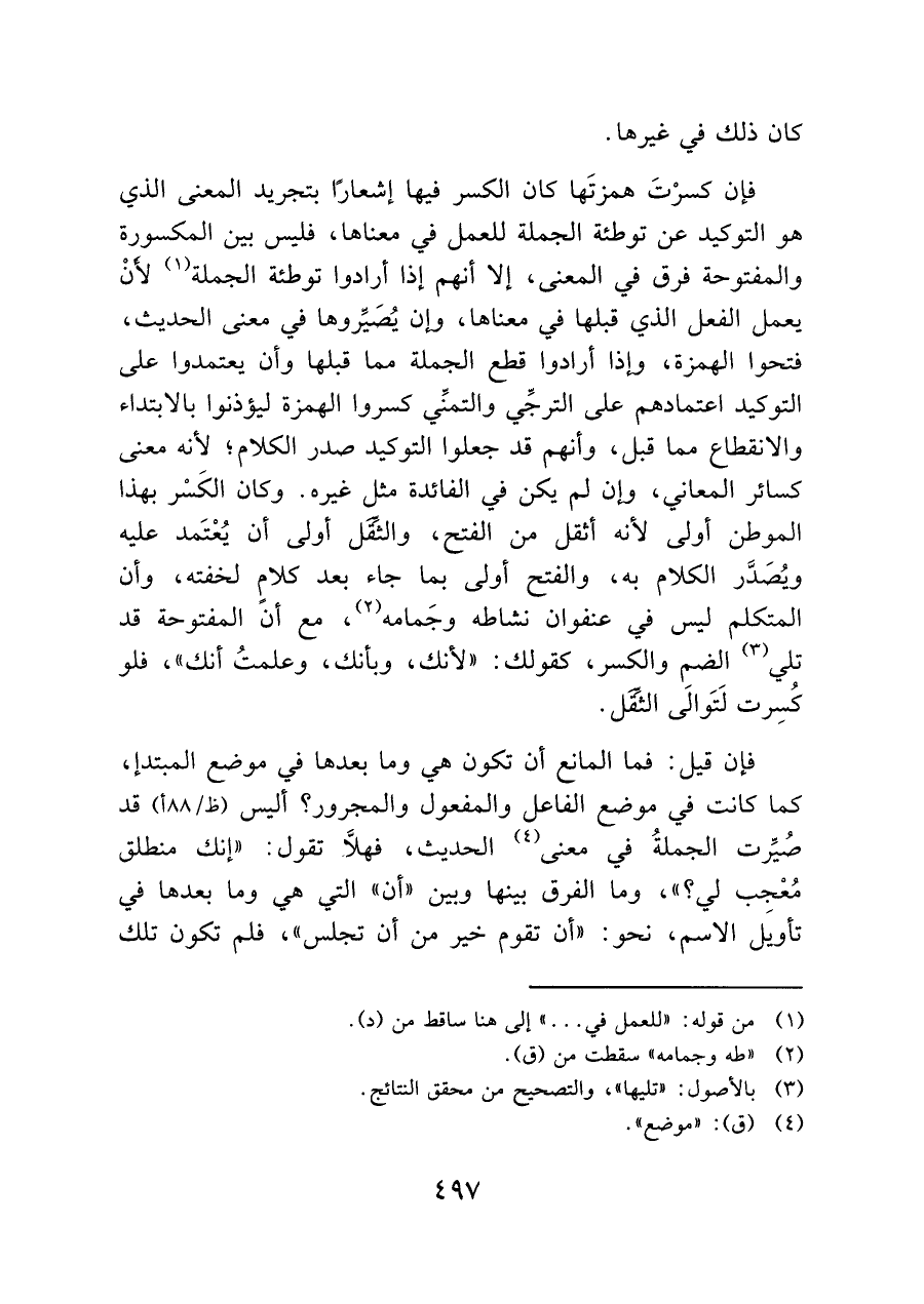 فإن كسرْتَ همزتَها كان الكسر فيها إشعارًا بتجريد المعنى الذي هو التوكيد عن توطئة الجملة للعمل في معناها، فليس بين المكسورة والمفتوحة فرق في المعنى، إلا أنهم إذا أرادوا توطئة الجملة (¬١) لأَنْ يعمل الفعل الذي قبلها في معناها، وأن يُصَيِّروها في معنى الحديث، فتحوا الهمزة، وإذا أرادوا قطع الجملة مما قبلها وأن يعتمدوا على التوكيد اعتمادهم على الترجِّي والتمنِّي كسروا الهمزة ليؤذنوا بالابتداء والانقطاع مما قبل، وأنهم قد جعلوا التوكيد صدر الكلام، لأنه معنى كسائر المعاني؛ وإن لم يكن في الفائدة مثل غيره. وكان الكَسْر بهذا الموطن أولى لأنه أثقل من الفتح، والثِّقَل أولى أن يُعْتَمد عليه ويُصَدَّر الكلام به، والفتح أولى بما جاء بعد كلام لخفته، وأن المتكلم ليس في عنفوان نشاطه وجَمامه (¬٢)، مع أنّ المفتوحة قد تلي (¬٣) الضم والكسر، كقولك: "لأنك، وبأنك، وعلمتُ أنك"، فلو كُسِرت لَتَوالَى الثِّقَل.