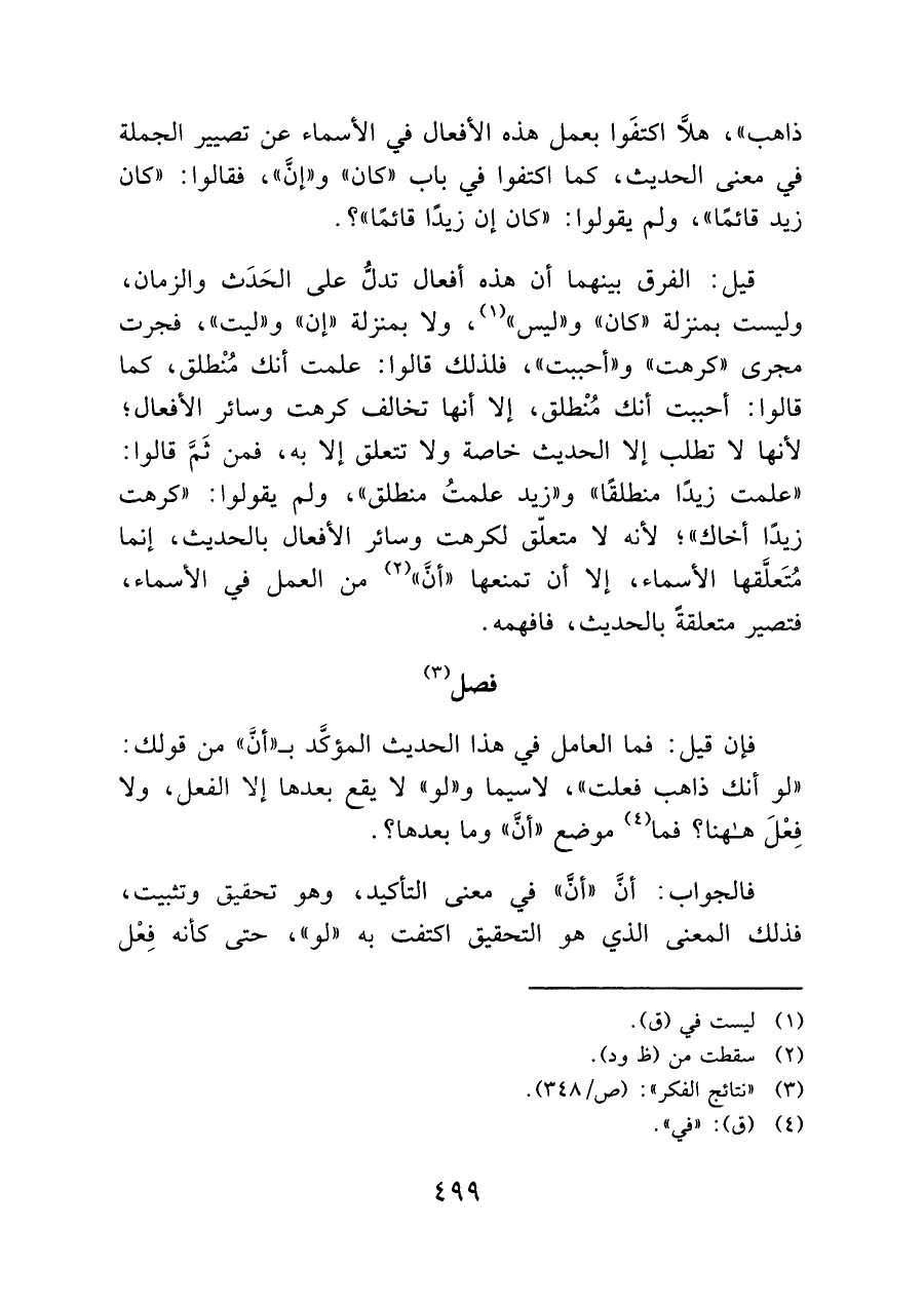 ذاهب"، هلَّا اكتفَوا بعمل هذه الأفعال في الأسماء عن تصيير الجملة في معنى الحديث، كما أكتفوا في باب "كان" و"إنَّ"، فقالوا: "كان زيد قائمًا"، ولم يقولوا: "كان إن زيدًا قائمًا"؟.