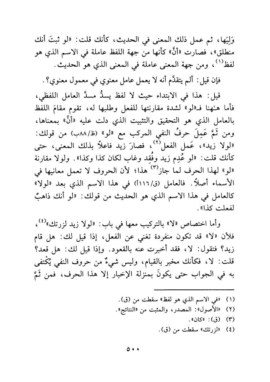 قيل: هذا في الابتداء حيث لا لفظ يسدُّ مسدَّ العامل اللفظي، فأما هاهنا فـ "لو" لشدة مقارنتها للفعل وطلبها له، تقوم مقامَ اللفظ بالعامل الذي هو التحقيق والتثبيت الذي دلت عليه "أن" بمعناها، ومن ثَمَّ عَمِلَ حرفُ النفي المركب مع "لو" (ظ/٨٨ ب) من قولك: "لولا زيد"، عَمل الفعل (¬٢)، فصارَ زيد فاعلاً لذلك المعنى، حتى كأنك قلت: "لو عُدِم زيد وفُقد وغاب لكان كذا وكذا". ولولا مقارنة "لو" لهذا الحرف لما جاز (¬٣) هذا؛ لأن الحروف لا تعمل معانيها في الأسماء أصلاً. فالعامل (ق/١١٦ أ) في هذا الاسم الذي بعد "لولا" كالعامل في هذا الاسم الذي هو الحديث من قولك: "لو أنك ذاهبٌ لفعلت كذا".