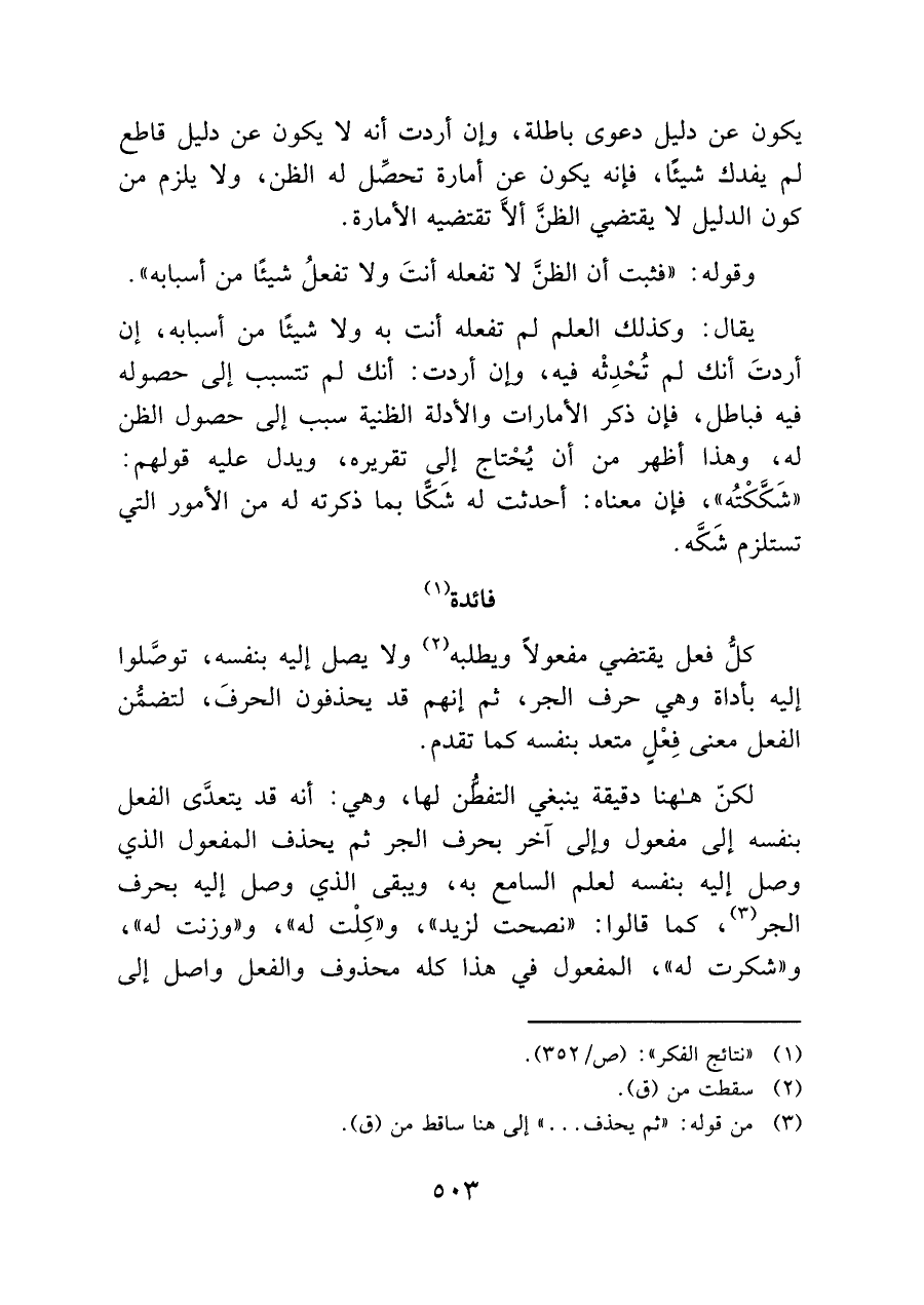 لكنّ هاهنا دقيقة ينبغي التفطُّن لها، وهي: أنه قد يتعدَّى الفعل بنفسه إلى مفعول وإلى آخر بحرف الجر ثم يحذف المفعول الذي وصل إليه بنفسه لعلم السامع به، ويبقى الذي وصل إليه بحرف الجر (¬٣)، كما قالوا "نصحت لزيد"، و"كِلْت له"، و"وزنت له"، و"شكرت له"، المفعول في هذا كله محذوف والفعل واصل إلى