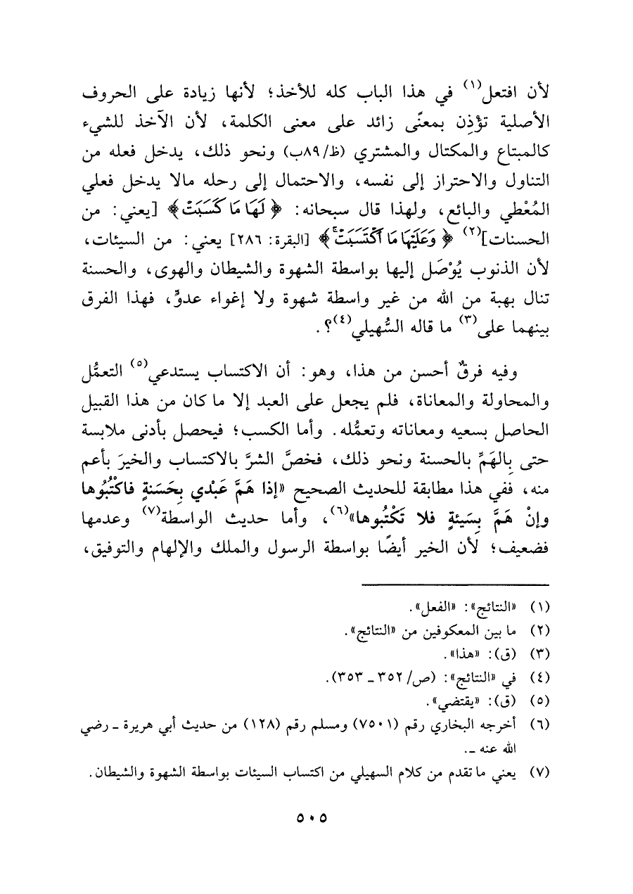 وفيه فرقٌ أحسن من هذا، وهو: أن الاكتساب يستدعي (¬٥) التعمُّل والمحاولة والمعاناة، فلم يجعل على العبد إلا ما كان من هذا القبيل الحاصل بسعيه ومعاناته وتعمُّله. وأما الكسب؛ فيحصل بأدنى ملابسة حتى بِالهَمَّ بالحسنة ونحو ذلك، فخصَّ الشرَّ بالاكتساب والخيرَ بأعم منه، ففي هذا مطابقة للحديث الصحيح "إذا هَمَّ عبْدي بحَسَنةٍ فاكْتُبوها وإنْ هَمَّ بسَيئةٍ فلا تكْتُبوها" (¬٦)، وأما حديث الواسَطة (¬٧) وعدمها فضعيف؛ لأن الخير أيضًا بواسطة الرسول والملك والإلهام والتوفيق،