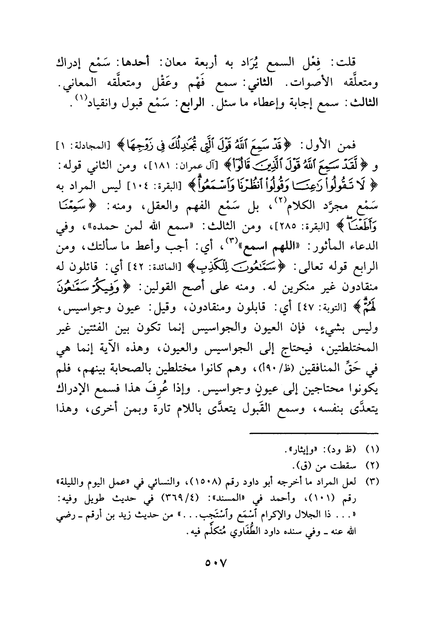 قلت: فِعْل السمع يُرَاد به أربعة معان: أحدها: سَمْع إدراك ومتعلَّقه الأصوات. الثاني: سمع فَهْم وعَقْل ومتعلَّقه المعاني. الثالث: سمع إجابة وإعطاء ما سئل. الرابع: سَمْع قبول وانقياد (¬١).
