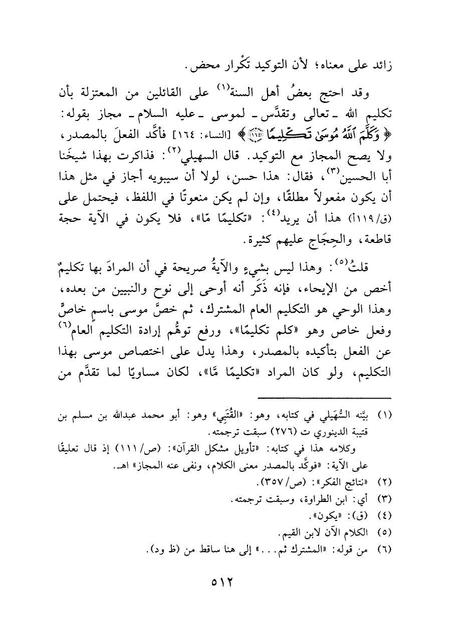 وقد احتج بعضُ أهل السنة (¬١) على القائلين من المعتزلة بأن تكلم الله -تعالى وتقدَّس- لموسى -عليه السلام- مجاز بقوله: {وَكَلَّمَ اللَّهُ مُوسَى تَكْلِيمًا (١٦٤)} [النساء: ١٦٤] فأكَّد الفعلَ بالمصدر، ولا يصح المجاز مع التوكيد. قال السهيلي (¬٢): فذاكرت بهذا شيخَنا أبا الحسين (¬٣)، فقال: هذا حسن، لولا أن سيبويه أجاز في مثل هذا أن يكون مفعولاً مطلقًا، وإن لم يكن منعوتًا في اللفظ، فيحتمل على (ق / ١١٩ أ)، هذا أن يريد (¬٤): "تكليمًا مّا"، فلا يكون في الآية حجة قاطعة، والحِجَاج عليهم كثيرة.