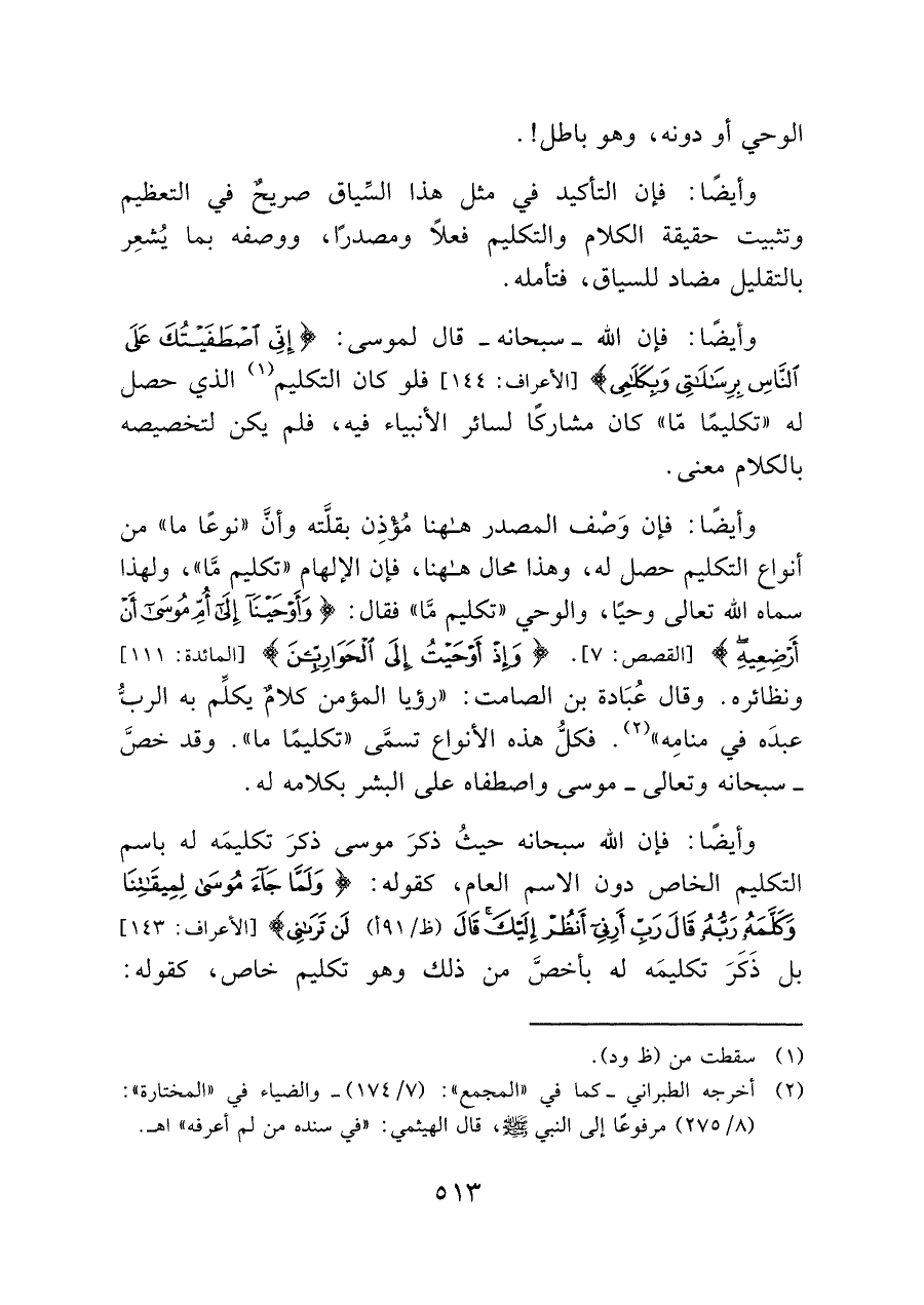 وأيضًا: فإن وَصْف المصدر هاهنا مُؤَذِن بقلَّته وأنَّ "نوعًا ما" من أنواع التكليم حصل له، وهذا محال هاهنا، فإن الإلهام "تكليم مَّا"، ولهذا سماه الله تعالى وحيًا، والوحى "تكليم مَّا" فقال: {وَأَوْحَيْنَا إِلَى أُمِّ مُوسَى أَنْ أَرْضِعِيهِ} [القصص: ٧]. {وَإِذْ أَوْحَيْتُ إِلَى الْحَوَارِيِّينَ} [المائدة: ١١١] ونظائره. وقال عُبَادة بن الصامت: "رؤيا المؤمن كلام يكلِّم به الربُّ عبده في منامِه" (¬٢). فكلُّ هذه الأنواع تسمَّى "تكليمًا ما". وقد خصَّ -سبحانه وتعالى- موسى واصطفاه على البشر بكلامه له.